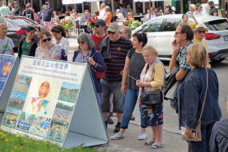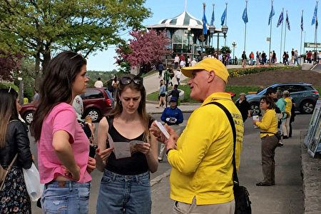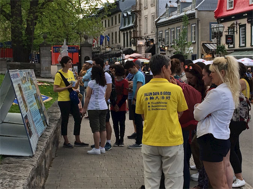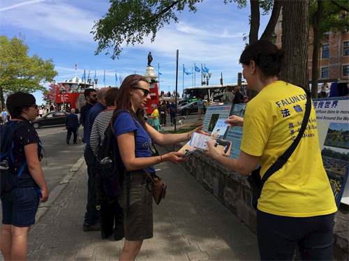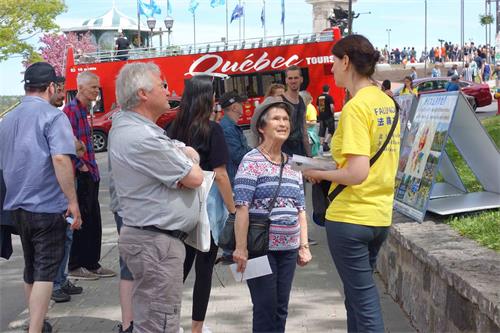 ![]() 图14~15:在魁北克市旅游景点兵器广场,游人在认真了解法轮功真相。 |