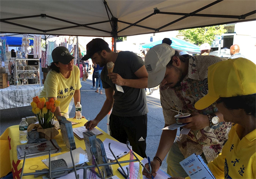 当天蓝天白云,夏意浓浓,满街都是惬意漫步的游人,法轮功学员展位前人流不断。人们或站在展位不远处观看学员炼功,或静静听学员讲真相,或明白真相后主动上前来签名。