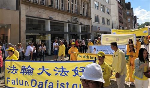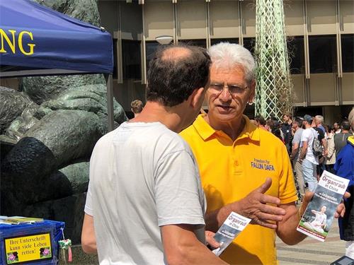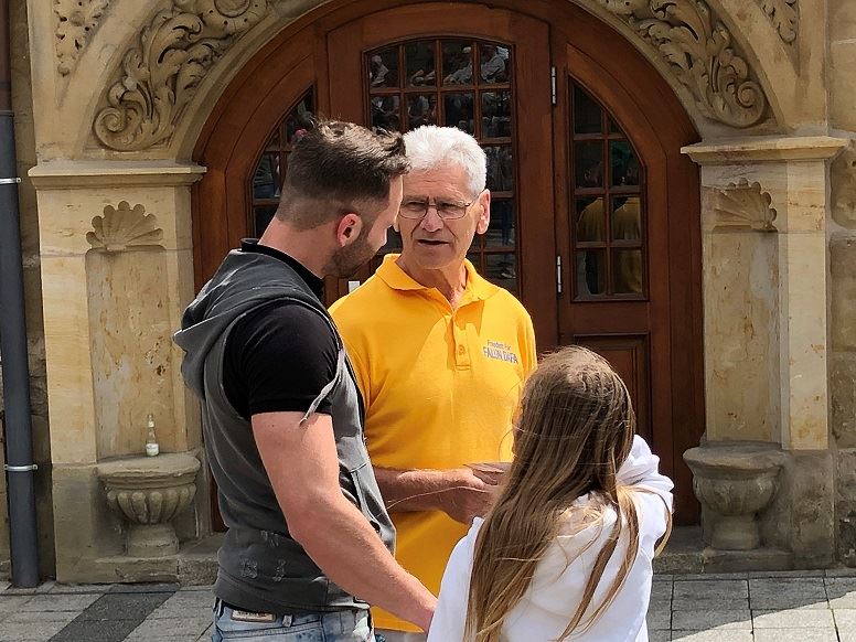 文化节这天,市政厅广场由于有歌舞表演也吸引了很多游客。在嘈杂的环境中,学员们平静,祥和的炼功氛围吸引了很多人的注意,许多人为打坐的学员拍照。由于比勒菲尔德市当地的学员长年讲真相,当学员一提法轮功时,许多人都表示听说过。往往学员们简单讲了中共的迫害后,民众就走到展台前为支持反迫害签名。