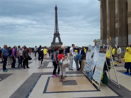 春夏之际,巴黎温暖如故,充满阳光。人权广场上游人如织,来自世界各地的游客们看到了法轮功学员炼功的场景,从高音喇叭中听到了法轮功在中国无辜遭受迫害的真相,从展板上了解到法轮功弘传世界的历程。很多人驻足,与法轮功学员详细交谈,了解更多信息。