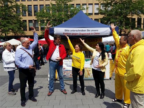有的德国人听到中共活摘法轮功学员器官,直接就走过来签字反迫害,有的从来没有听说过,法轮功学员就耐心地解释,什么是法轮功和中共如何残酷迫害法轮功。有一名德国女士告诉学员,十五年前,她就在德国多特蒙德了解了法轮功遭到迫害的真相,如今这么多年过去了,让她惊讶的是,迫害还没有结束,她也在制止活摘的真相薄上签了字。