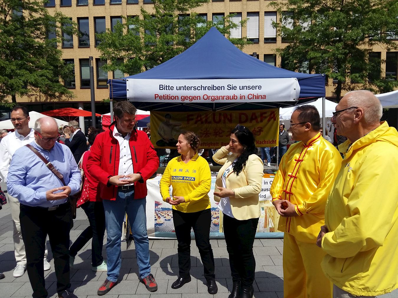 从二零零九年起,法轮功学员几乎每年都会参加文化节,今年法轮功学员除了在舞台上展示功法,还设立了一个信息展位。去年德国的政治家们来到法轮功的信息展位问候并学炼了法轮功的第二套功法:法轮桩法。今年德国的政治家们又来到法轮功的信息展位前,和法轮功学员一起炼第三套功法:贯通两极法。这些政治家是国会议员米歇尔·泰晤士先生(Michael Thews),吕嫩市综合委员会阿德米亚博士(Dr. Azsun.Aydemir),吕嫩市长代表后斯特·穆勒·巴德先生(Host Müller Bad)。