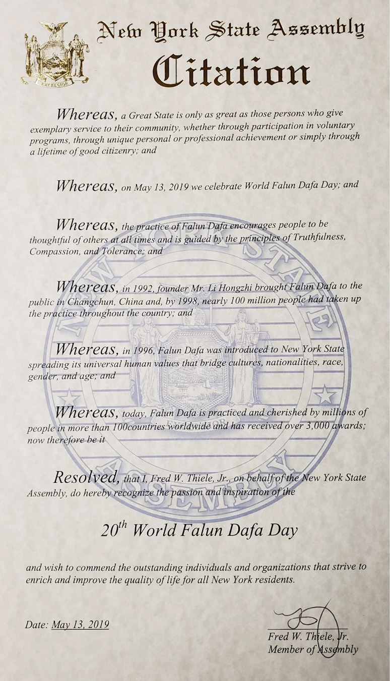 特此宣告, 作为纽约州议会正式当选的议员,我赞赏“世界法轮大法日”的杰出庆祝活动,并拥抱那些为法轮大法而感到骄傲的支持者和修炼者。