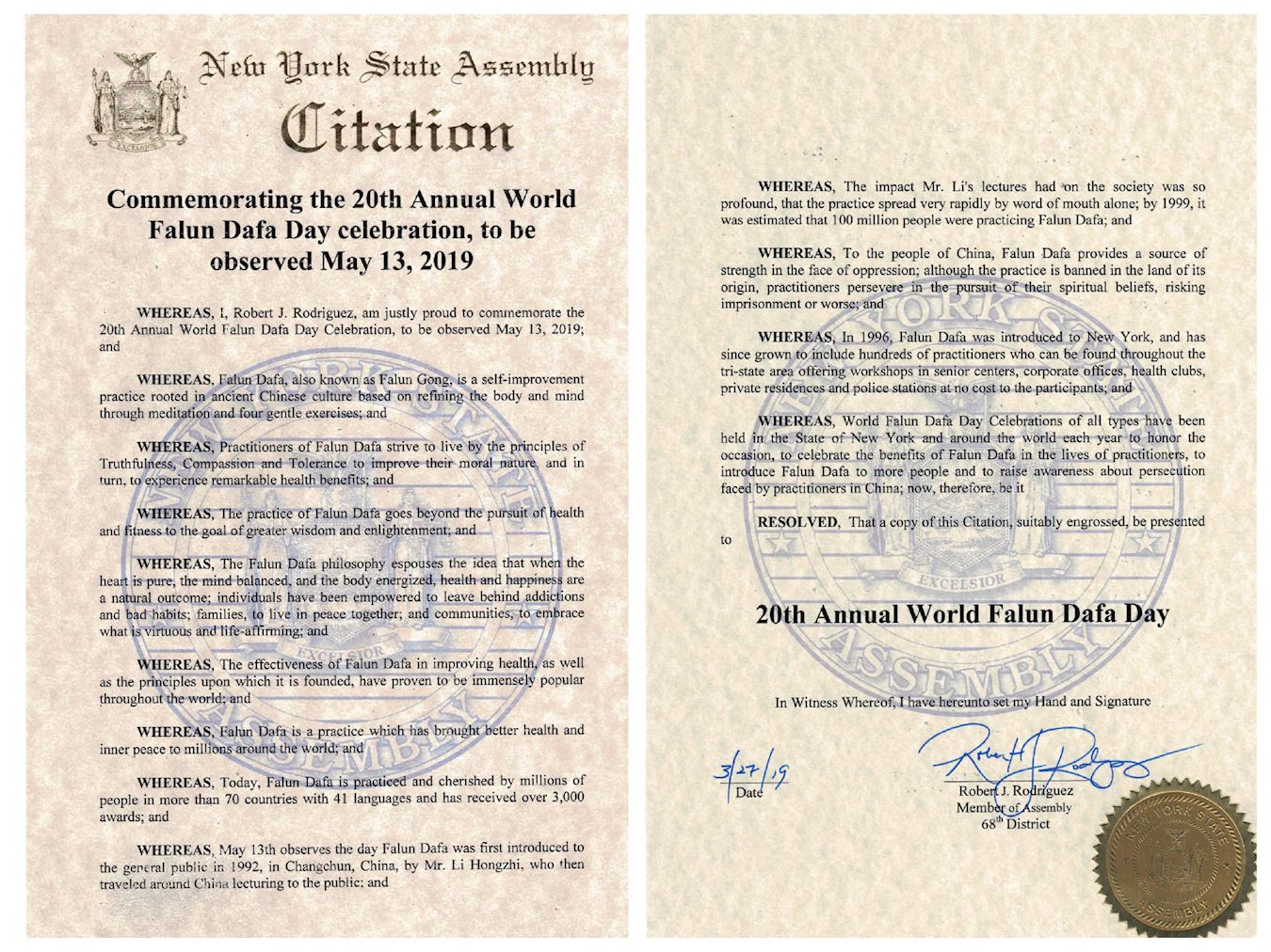 蒂勒和罗德里格斯,这两位州众议员他们颂扬李洪志先生于1992年开始不辞辛劳在中国传法,并很快有近亿人修炼,1996年传入纽约并服务于社区,现在大法已洪扬世界上100多个国家并得到3000多褒奖。
