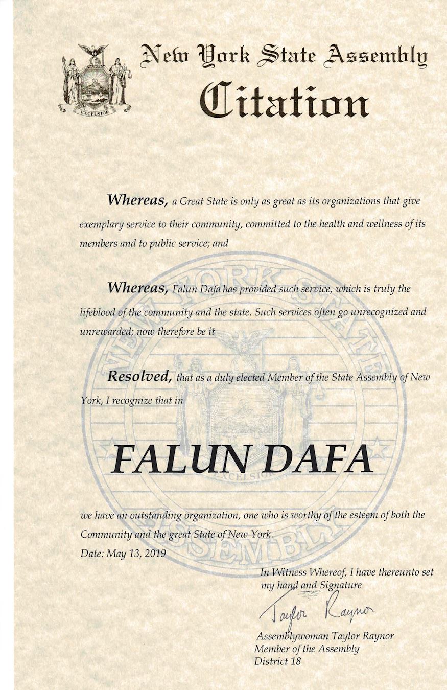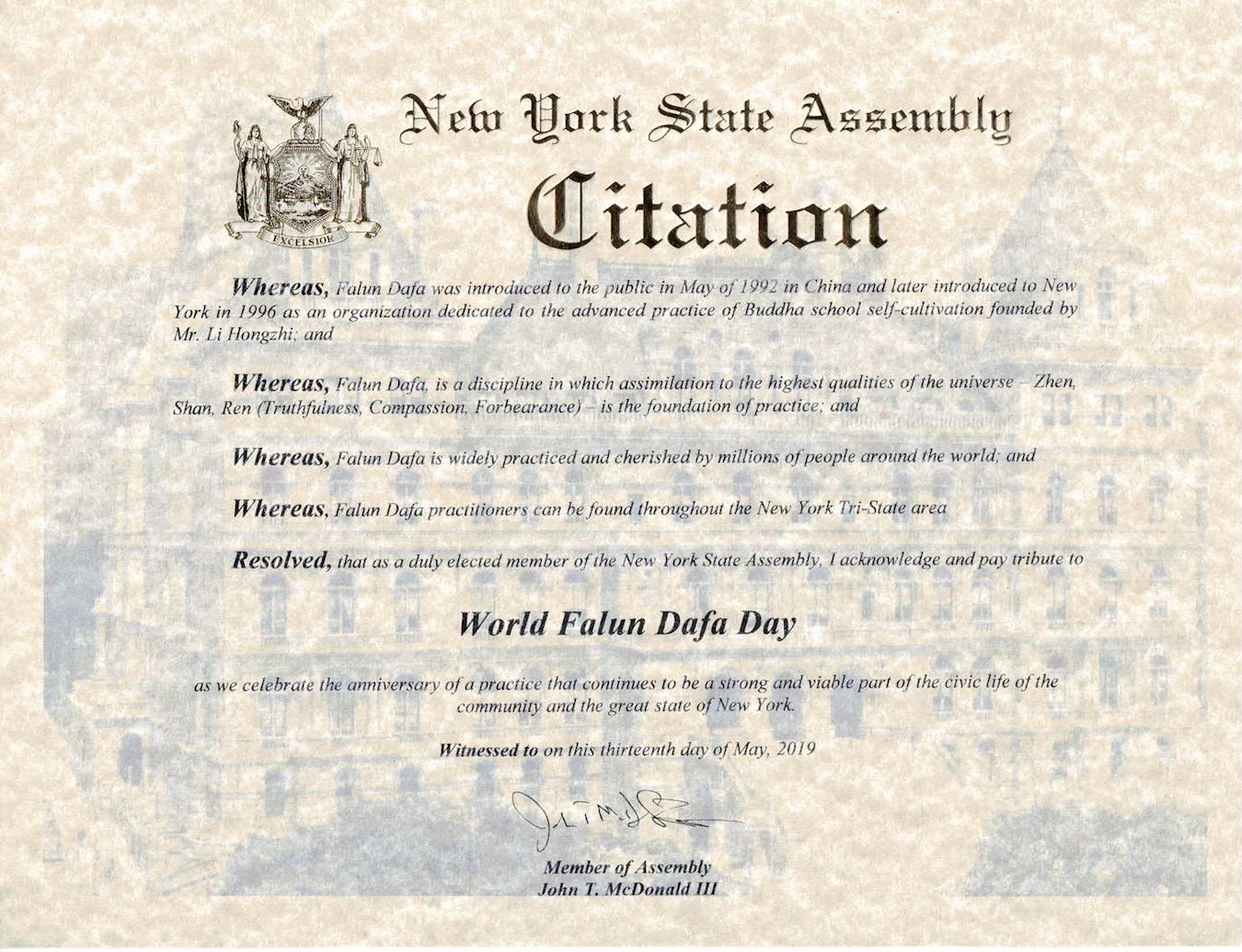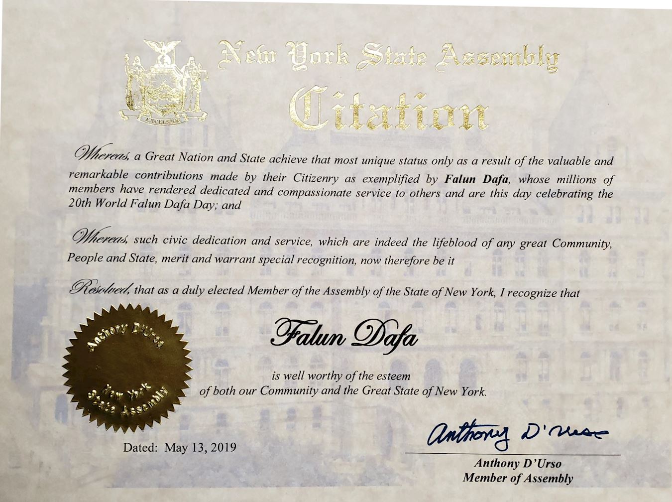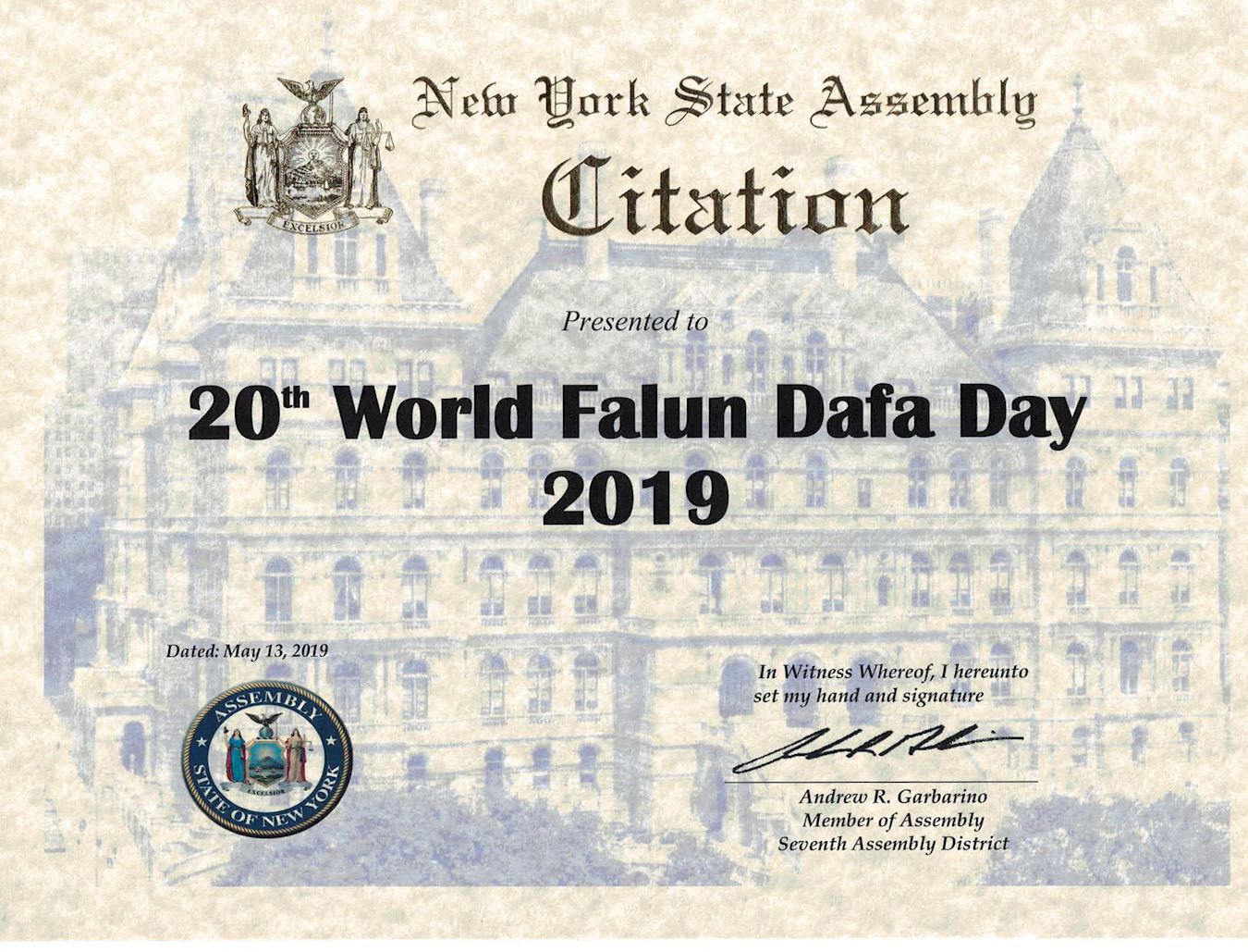 【明慧网二零一九年六月二十日】今年是法轮功弘传世界二十七周年暨第二十届世界法轮大法日”, 纽约州继四十五位众议员共同签署恭贺函之后,又有十二位州众议员各自颁发褒奖、贺信颂扬“真、善、忍”是普世价值,赞扬法轮大法对社区的贡献和法轮大法洪传世界的盛况。