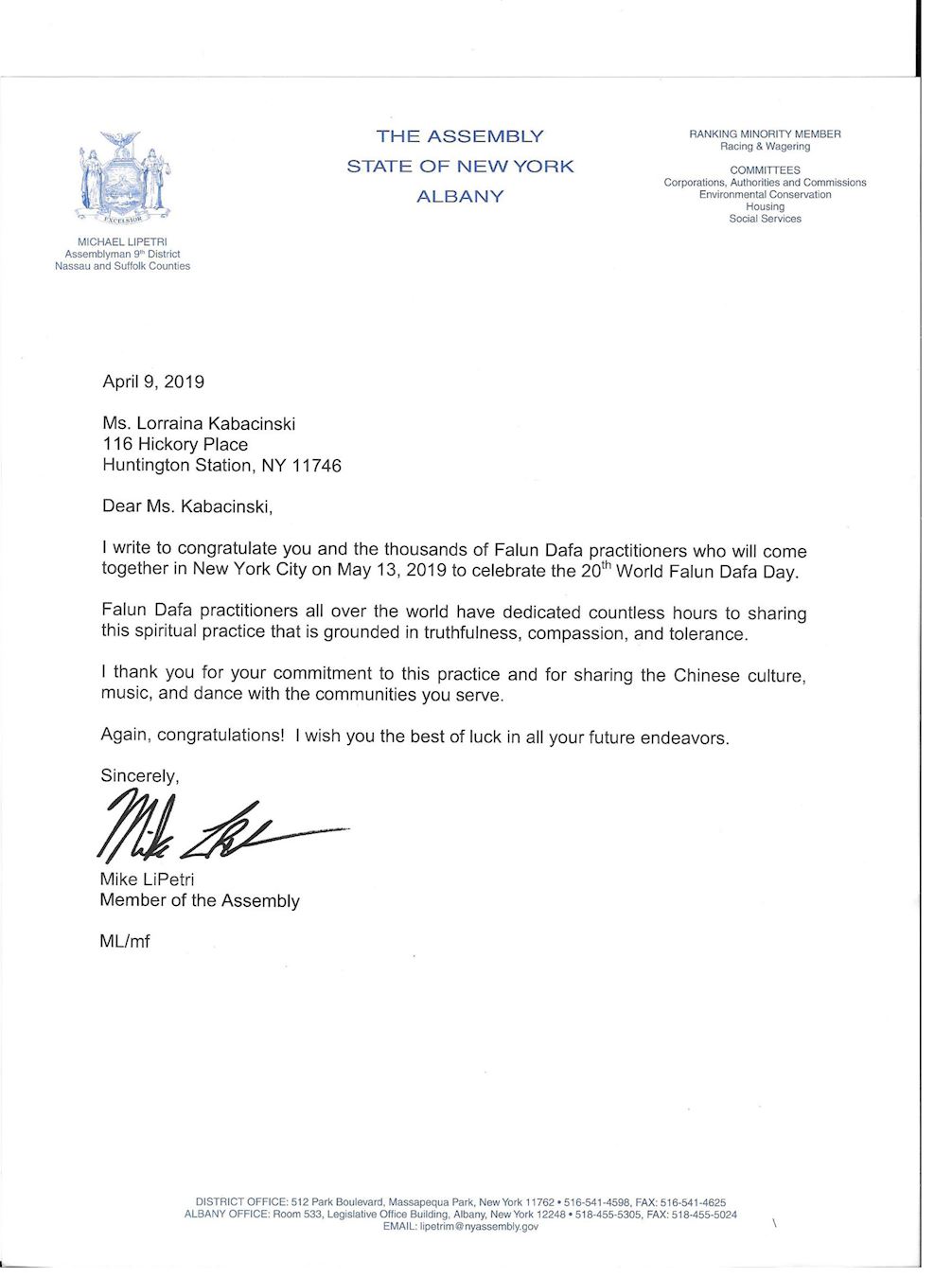 图10:第九选区众议员迈克·利佩特里(Mike Lipetri)发贺信称颂大法,祝贺第二十届世界法轮大法日。