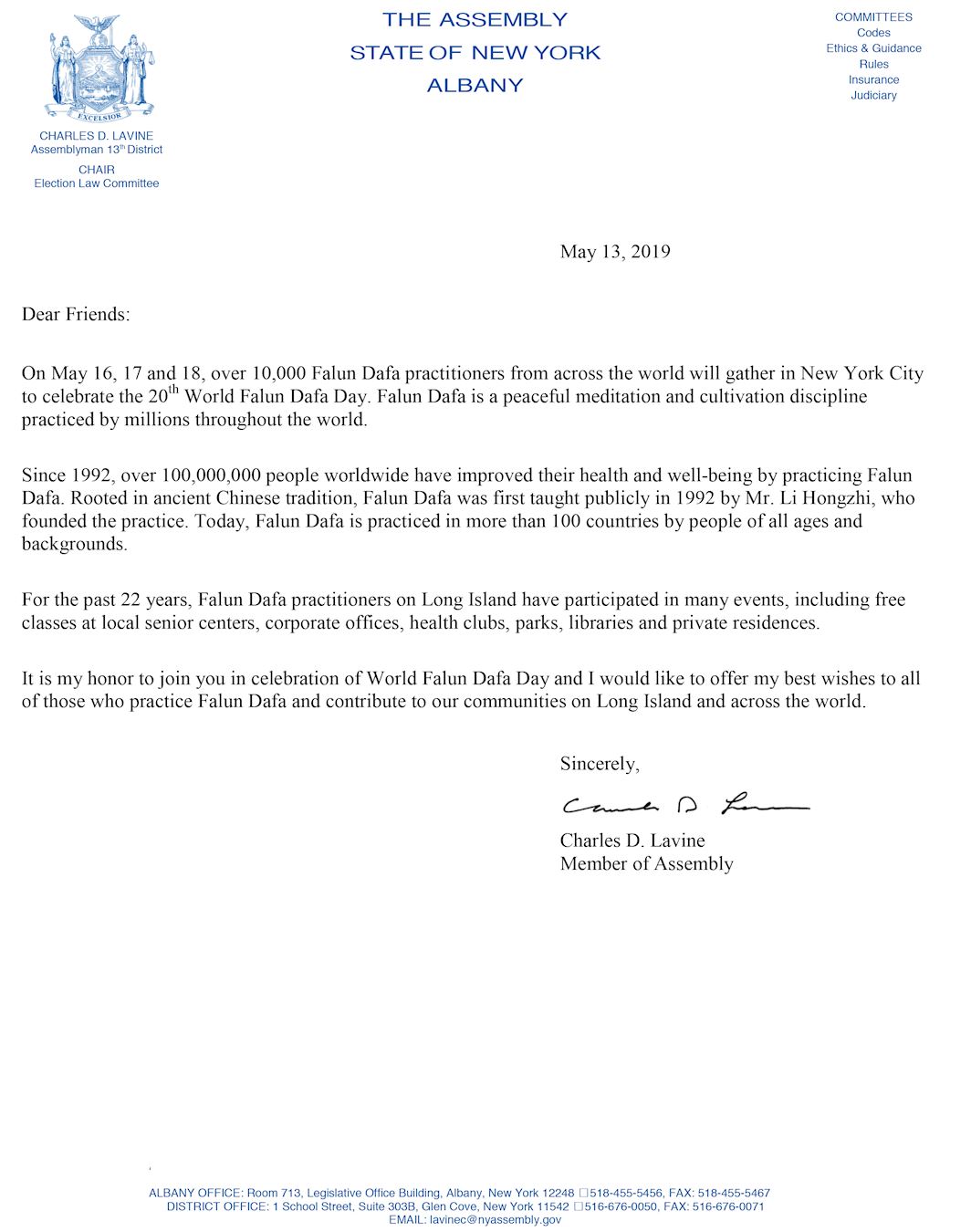 图11:第十三选区众议员查尔斯·拉维恩(Charles D. Lavine)发贺信称颂大法,祝贺第二十届世界法轮大法日。
