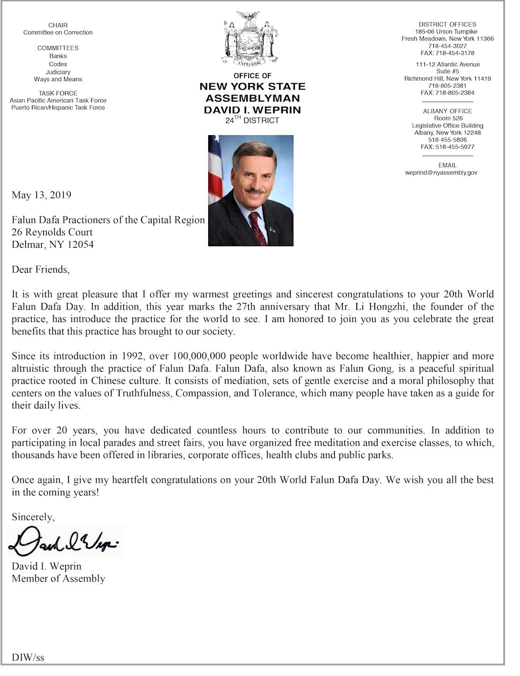 '图12:第二十四选区众议员大卫·韦普林(David I. Weprin)发贺信称颂大法,祝贺第二十届世界法轮大法日。'