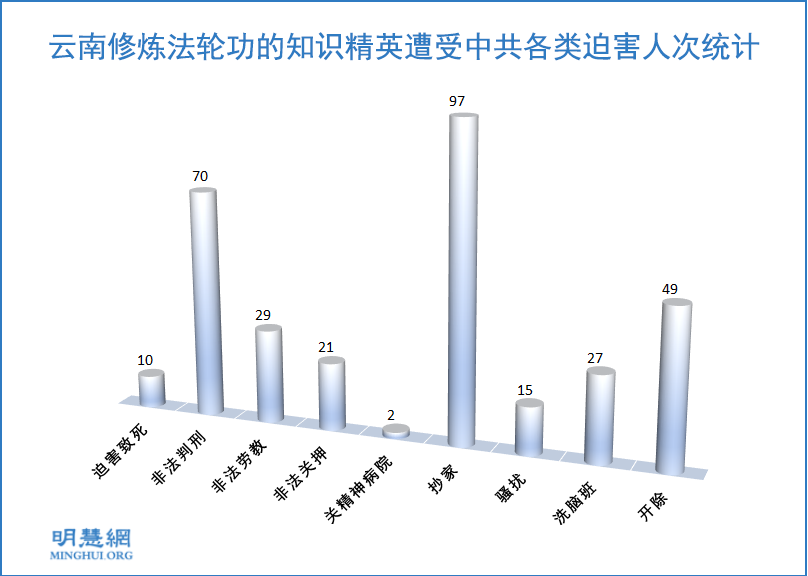 从被迫害类型中看,致死10人,占10%;非法判刑71人次,占71%;刑期最长10年,占已知云南被非法判刑432人的16%;劳教29人次,占29%,占已知云南被劳教474人的6%;开除公职49人,占49%;关押21人次(实际远远大于此数),占21%;洗脑班27人(实际远远大于此数),占27%;骚扰15人(实际远远大于此数),占15%;抄家6人(只是抄家抢劫财物,实际远远大于此数),占6%;被关进精神病院2人,占2%。