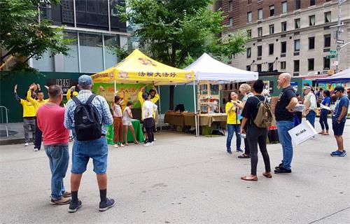 【明慧网二零一九年六月二十一日】二零一九年六月十六日(周日),纽约曼哈顿第六大道举办了“春天街市”,街市从四十二街一直延续到五十五街,约两百个摊位包含了手工艺品和各式美食。法轮功学员也在这次街市中伴随着祥和的炼功音乐展示五套功法,与大家分享修炼的美好,以及揭露中共独裁政权现在仍大规模残酷迫害法轮功。