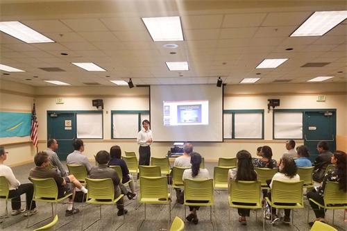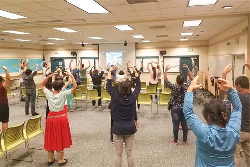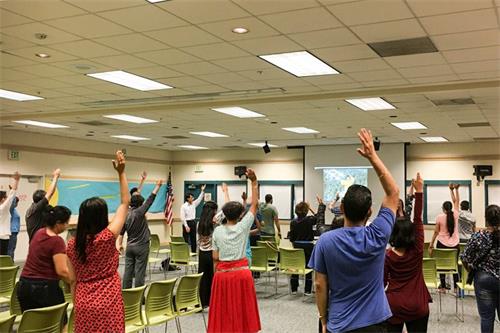从旧金山来参加教功班的梁女士说,她在香港时就接触过法轮功,并有幸见过李洪志师父,但当时她要照顾家庭,没有继续炼下去。当天学功后,她感觉很好,“很开心,炼功时全身发热。”