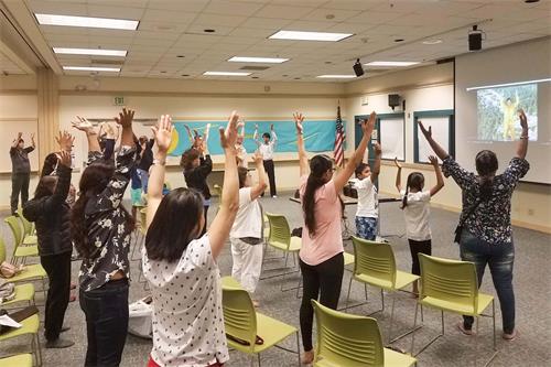 当天,有几十人参加了教功班。许多人学功后,感受到能量,身体感到放松,很舒服。一个两岁大的孩子跟着母亲来参加教功班,他告诉妈妈:不要走,银幕上有个大佛。