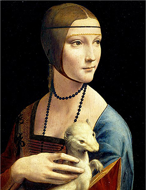 ![]() 图2:《抱银貂的女子》(意大利语:Dama con l'ermellino,英语:Lady with an Ermine)作者意大利文艺复兴时期画家:列奥纳多·达芬奇(Leonardo da Vinci),此画于1489年-1490年在米兰创作完成,目前收藏于波兰克拉科夫的恰尔托雷斯基博物馆。 |