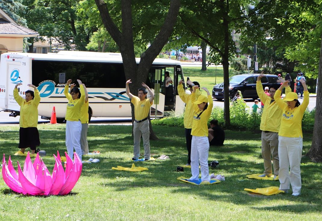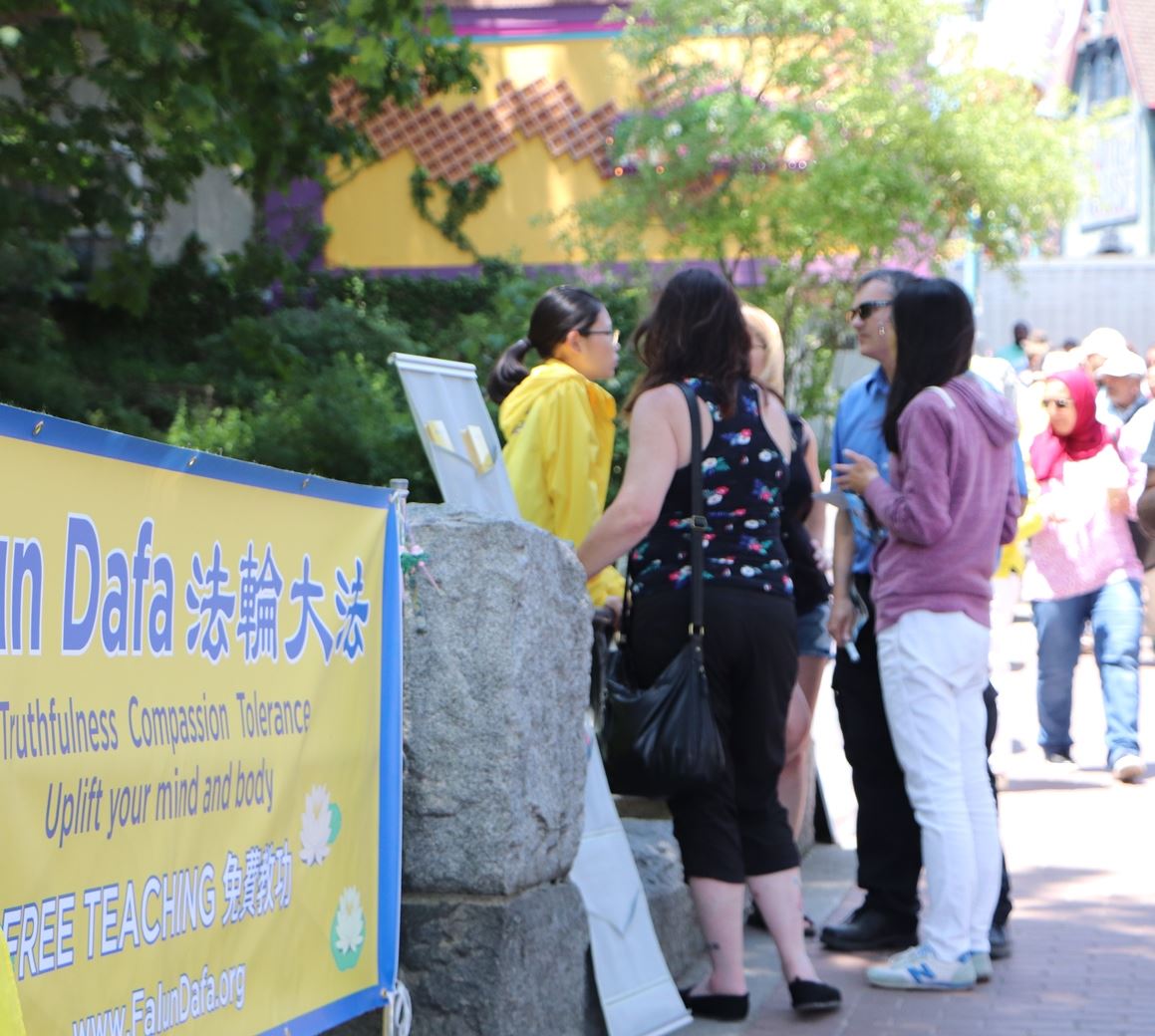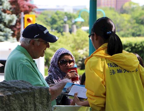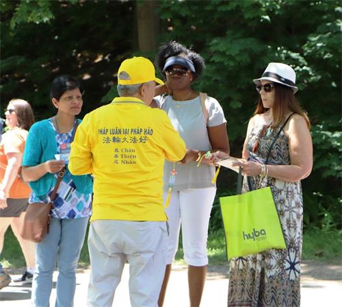 尼亚加拉瀑布(Niagara Falls)景点是加拿大游客人数最多的世界级景点,每年大约接待两千万游客。从二零一八年夏天开始,多伦多的法轮功学员在这里建立了一个炼功点,每天经过炼功点的游客至少有一万人。今年夏天开始,距离瀑布开车一个半小时路程的多伦多学员每天都开车到此弘法和讲真相。很多游客纷纷接资料,咨询什么是法轮大法,不少人留下来学功法;不少中国游客在此明白了真相后做了“三退”。二零一九年六月二十二日,法轮功学员张女士一天就劝退了五十六人。