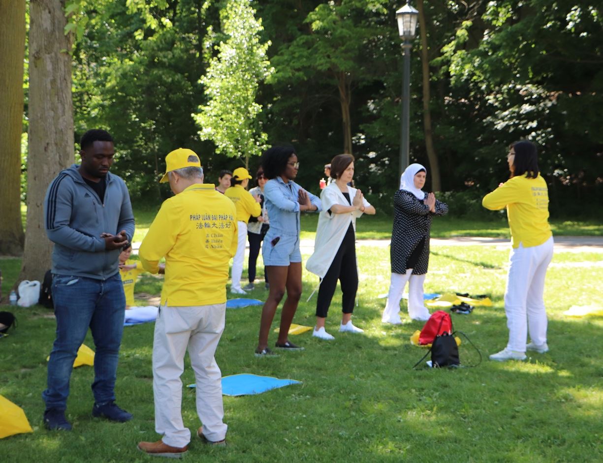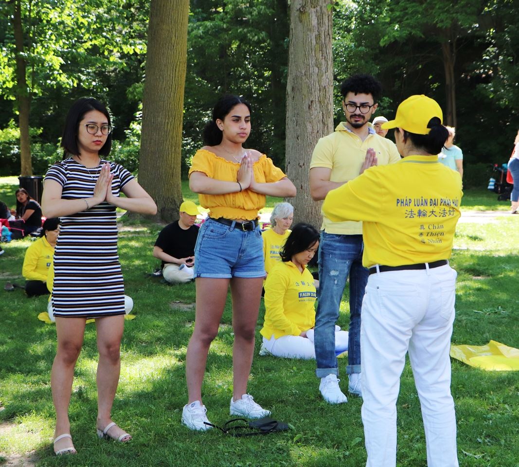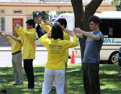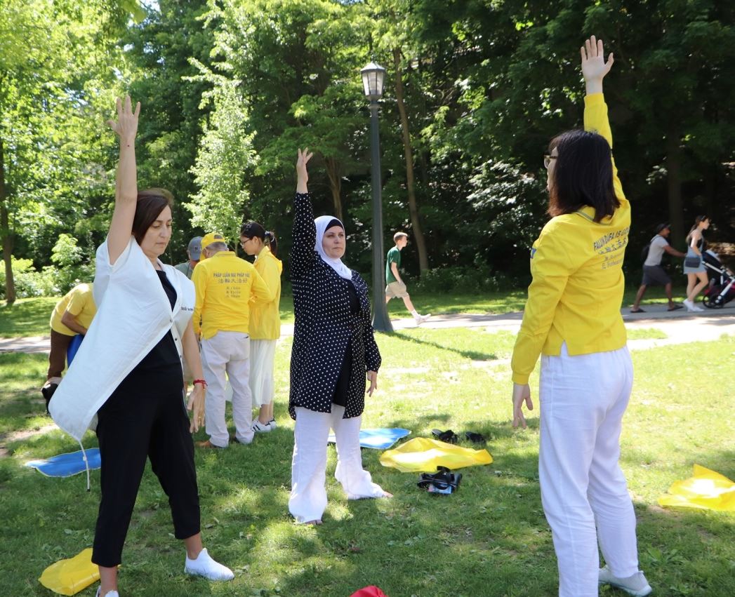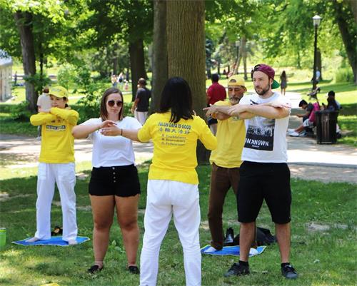 和朋友们一起来旅游的萨蒂-哈山姆迪先生(Sayed Hassamudin)是第一次听说法轮大法,看到法轮功学员炼功时他非常感兴趣,他很认真的开始学炼法轮大法的第一套功法,他说:“我出生在巴基斯坦,我今天是来多伦多旅游,我想看看在加拿大发生了什么。在这一看,我很感兴趣:为什么他们会炼功?”