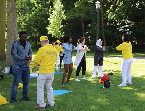 来自俄罗斯的恩格(Inga)尽管是第一次听到法轮功,但她非常认真的跟学员学炼了动功及静功,她学炼完后说:“我真的是太喜欢了!在炼动作之前,我的后背感觉到麻木,当我炼完动作后,我感到对缓解后背的麻木很有帮助。而且,我还感受到手掌有温暖的感觉。”