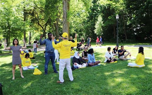 来自埃及的兄妹俩乔治(George)和莎拉(Sarah)很认真的学完了动功,哥哥是大学理科学生,妹妹是学政治学的。妹妹说看到这个场面就非常吸引我们,就来学了。非常感谢法轮功学员!哥哥说:“我觉得很放松,还有一种血液流动得很好的感觉。”