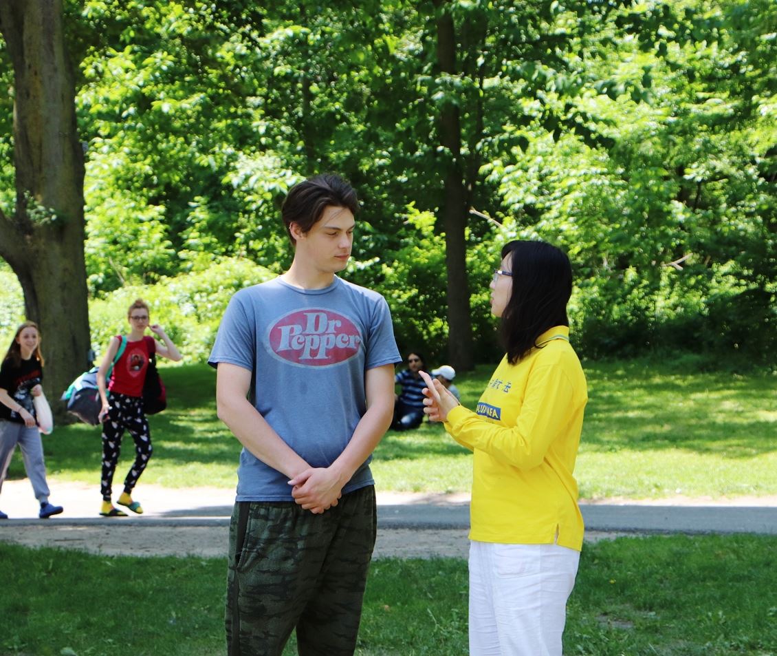 在多伦多大学做博士后的李先生和母亲一起来大瀑布旅游,当法轮功学员向他的母亲讲真相时,李先生很不耐烦地对母亲说:“不要理他们,我听的太多了。”学员开始耐心地向李先生讲了人今天的所有成就都是人前生的德造成的,他开始慢慢接受学员讲的真相。到最后李先生和母亲都同意做了“三退”。当他们得知法轮大法的著作《转法轮》已经翻译成三十九种语言时感到非常震惊。临别时,他们非常感谢法轮功学员给他们讲述了这么多他们不知道的信息。
