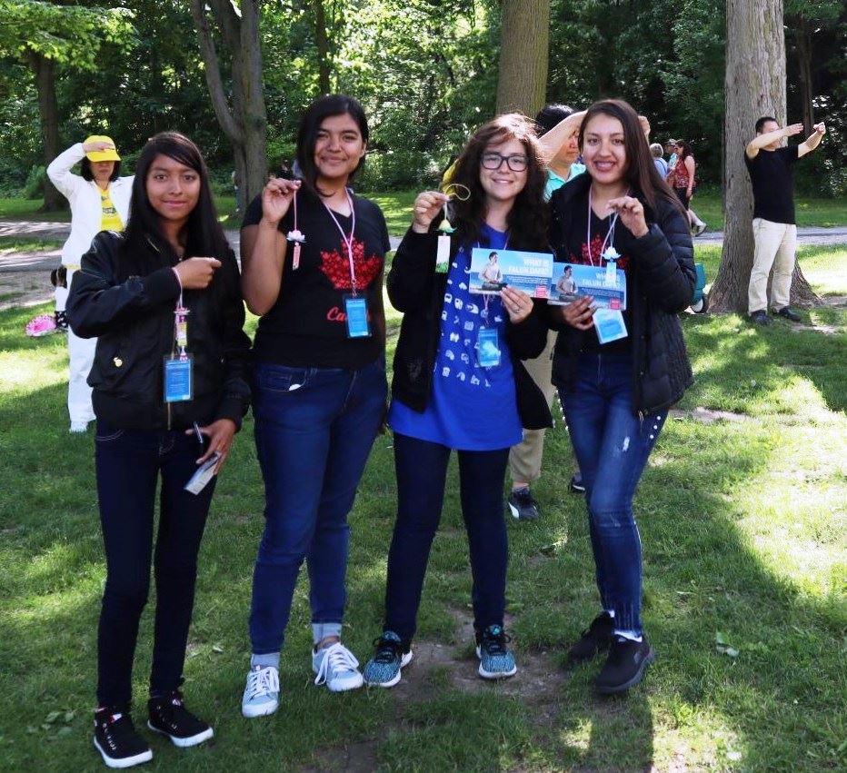 一个来自墨西哥的中学生旅游团,她们也加入到炼功场里跟着炼功。炼完功后,卡拉(Karla) 说:“感觉真的太美了,我们都很喜欢这个功法。”另一个学生詹妮弗(Jennifer)说:“很高兴在这里遇上他们(指法轮功学员)。”临走前,她们手举学员赠送的纸莲花开心的合影。
