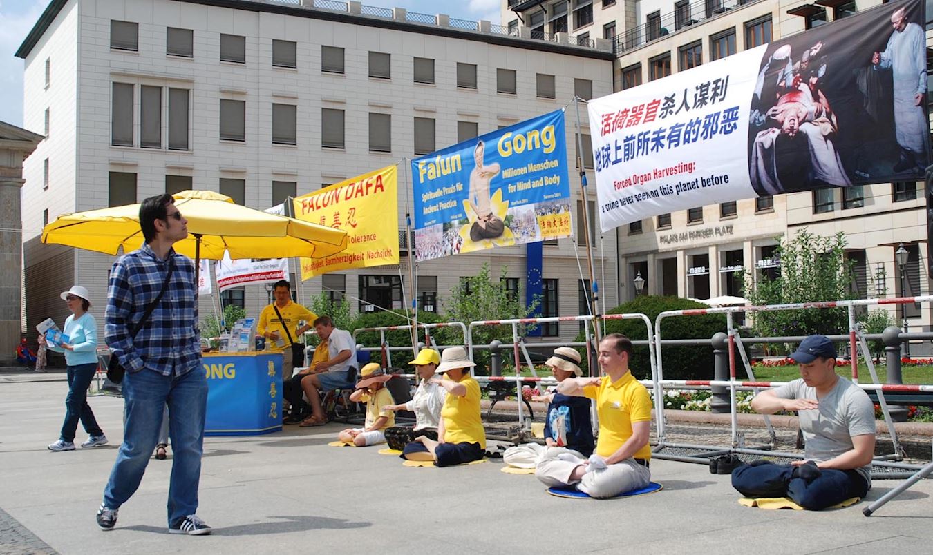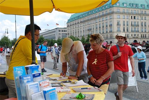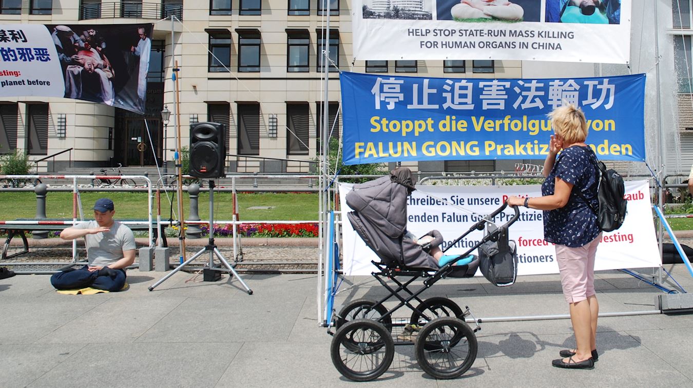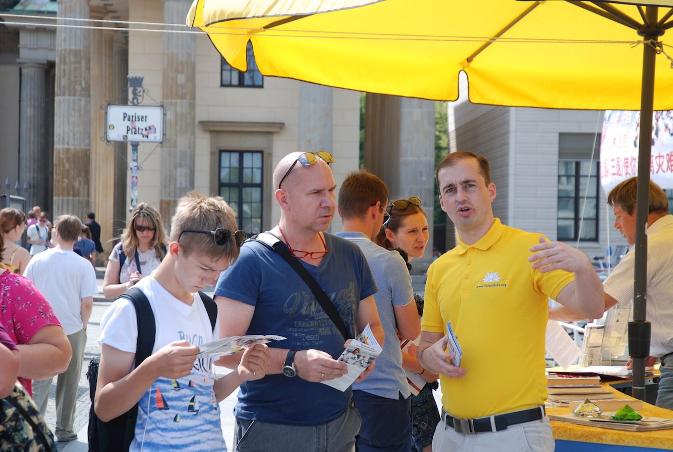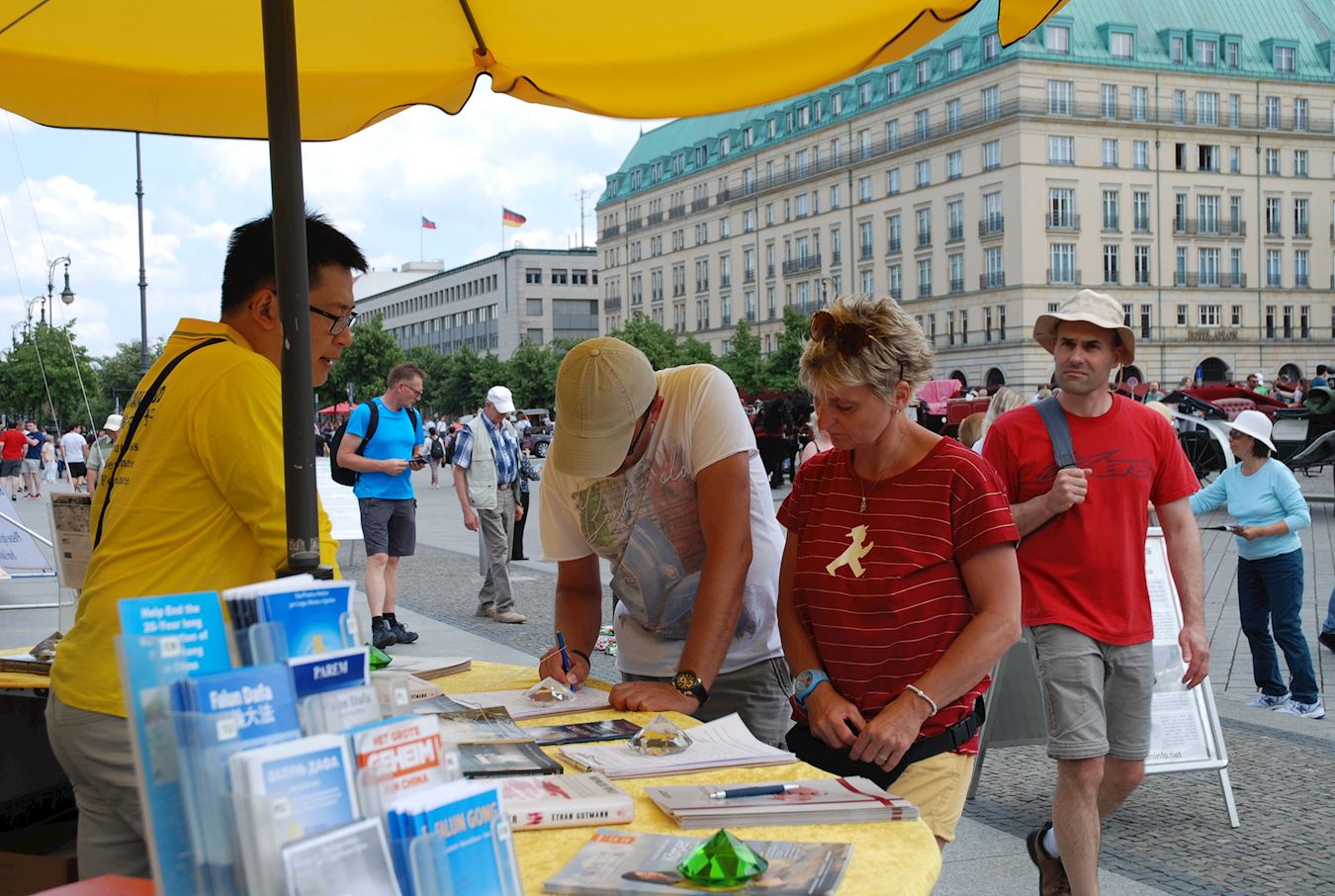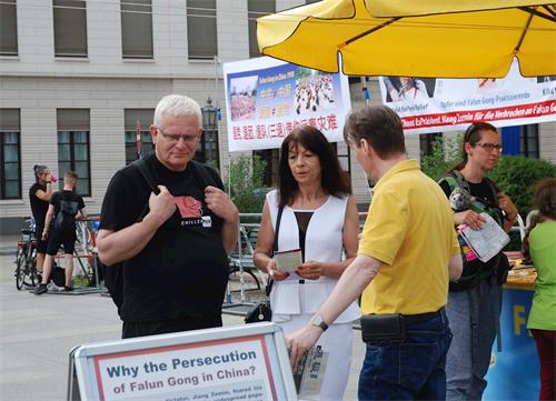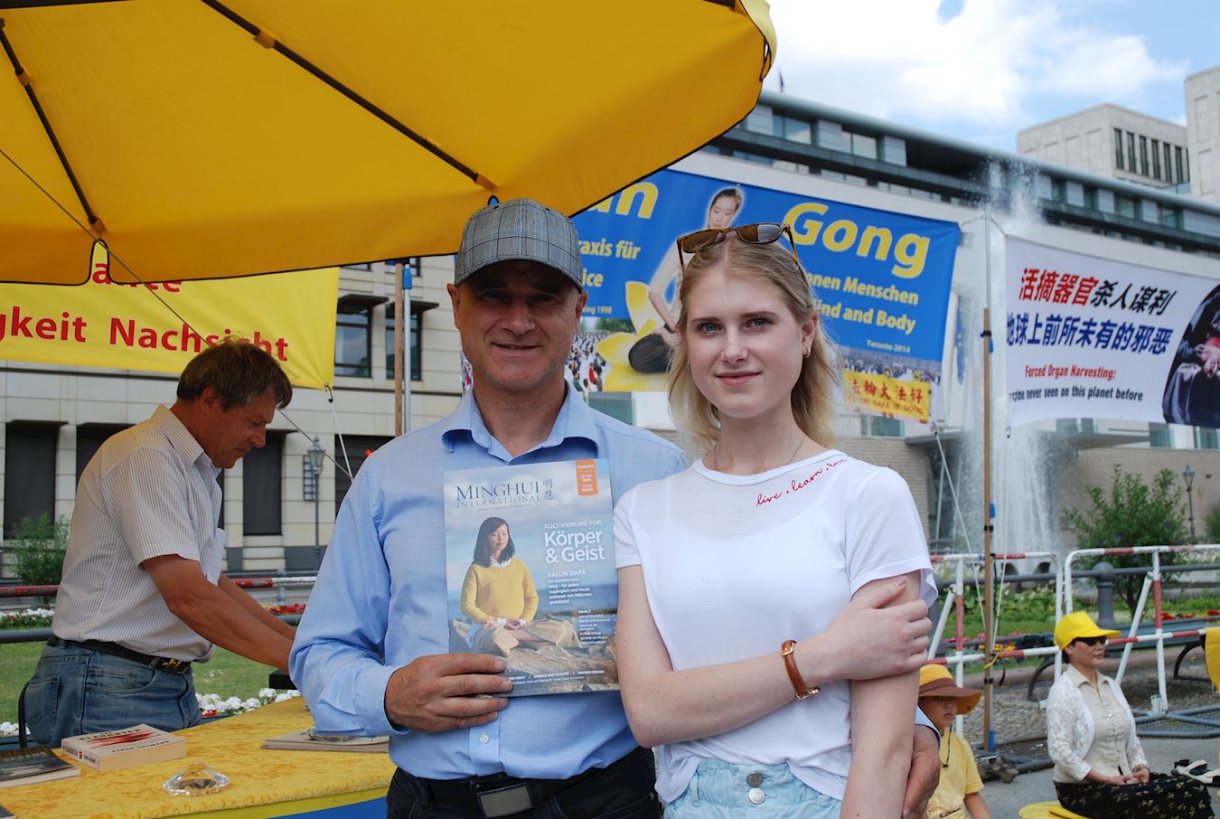 一位不苟言笑的中年男子带着他的女儿站在横幅正面看了很久,他从一个女学员手里接过传单之后,雕塑般一动不动地阅读。从头至尾读完最后一个字,抬起头看着横幅,凝固在原地一般。一直到学员告诉他说:“您可以在征签表上签字,帮助法轮功学员制止迫害。”他才有点回过神来,拉着女儿走到展桌前。他说,“难以想象!我完全不能想象,没有得到别人的同意,就能够从一个人的身体上摘取器官,这是我想都不敢想的,闻所未闻。”他神情严肃,急促的语气中透着激动和愤怒。他叫布荷勒(Buechler),是柏林人,多年前去过天津,对中国的印象很好。他连连说:“没想到在中国有这样的事。”他向法轮功学员提了许多问题,非常关心德国政府有没有向中国施压,有多少效果,对收集迫害证据有没有提供帮助。
