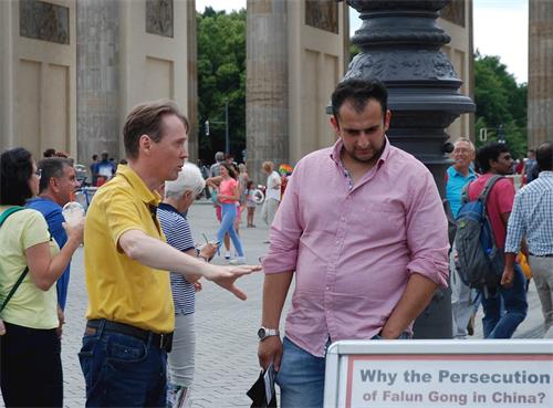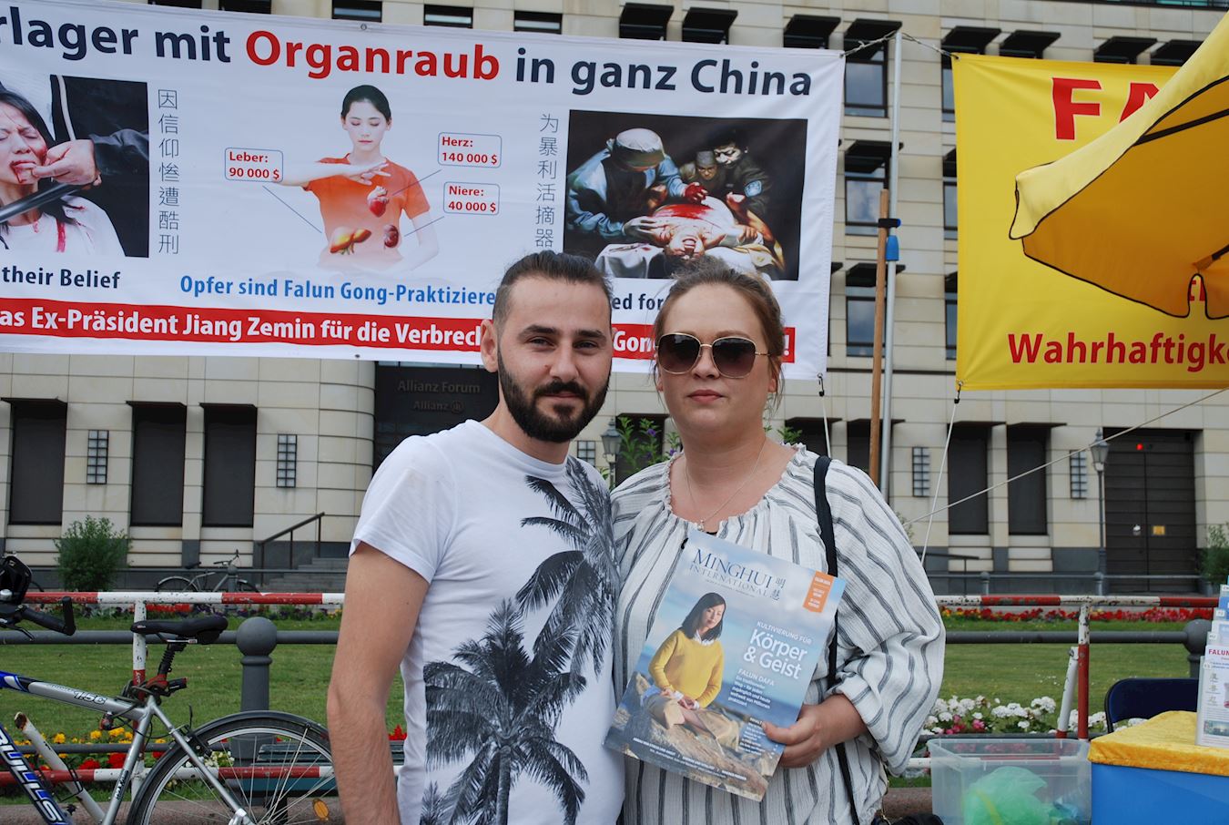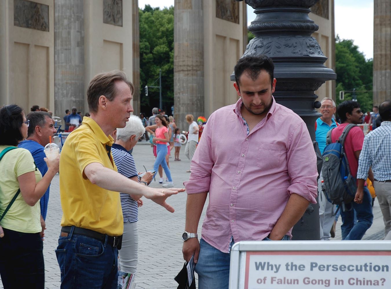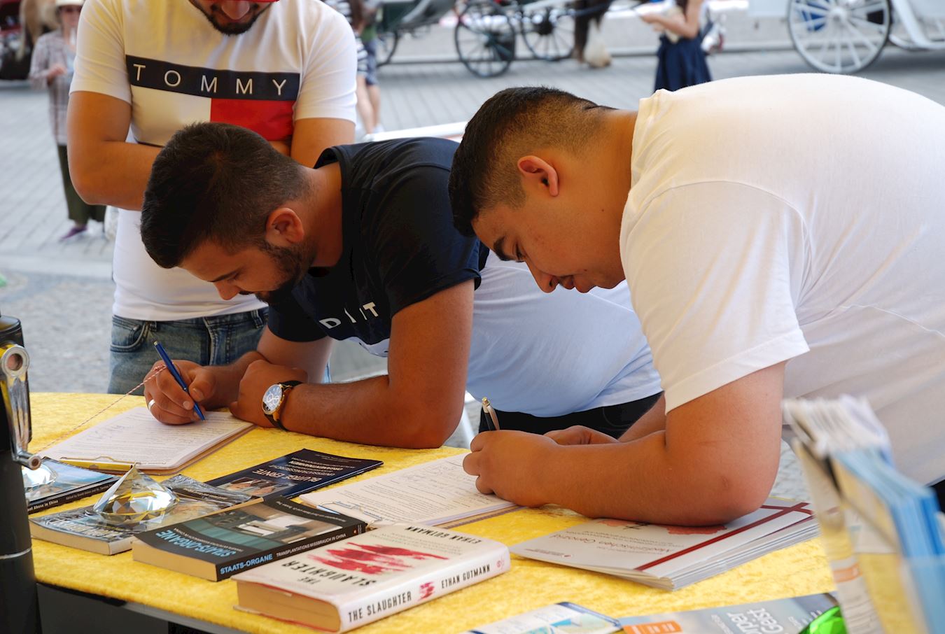 哈桑(Hasan)和朋友一行三人正经过展桌前,看到横幅上的内容后表示“吓了一跳,非常震惊”,他和其中一个朋友向法轮功学员了解到中共迫害法轮功的情况,马上在征签簿上签了名支持法轮功学员。哈桑说:“(活摘器官这事)太可怕了,这在当今社会是不能被接受的。我希望通过我的签名,能够表达我对这个事情的态度。中共对这个信仰团体所做的令人发指的事情,严重违背人的尊严。”他和朋友们今晚就离开柏林,他向学员表示“非常感谢你们让我知道这件事”。