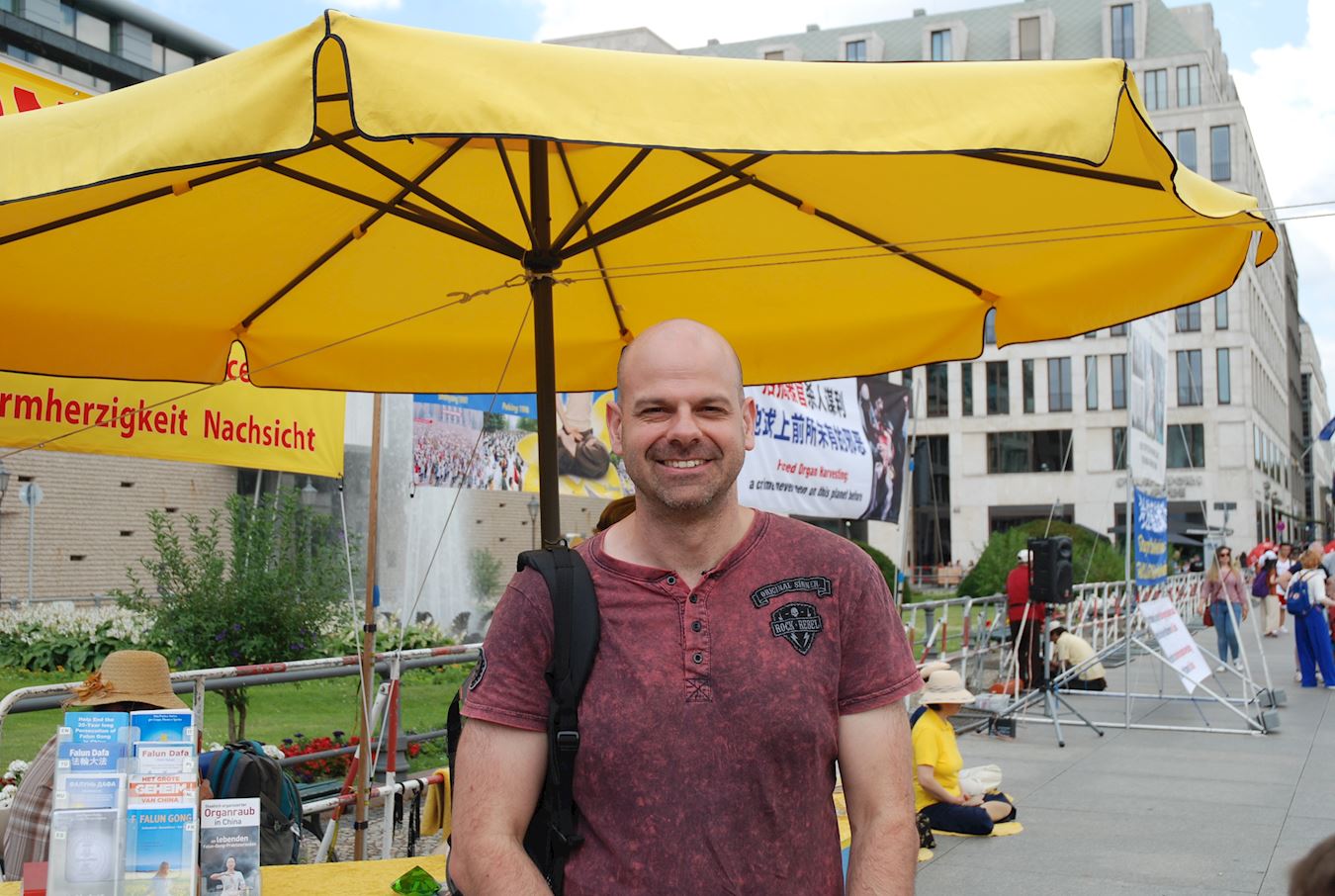 克里斯多福(Christophe)来自比利时的Gent,来柏林旅游,他在征签表上签字后,告诉记者:“我以前在比利时布鲁塞尔自由大学听一位教授做过器官移植的讲座,了解到器官来源是个敏感问题。我今天看见这群法轮功学员,我真的没有想到这个事情(活摘器官)还在继续,而且法轮功学员是最主要的受害群体。”“我相信法轮功是一个非常好的功法,他们(法轮功学员)留意到别人,动作看上去也非常的祥和好看。我不理解为什么这样的功法会受到迫害,也许是因为他们人数众多吧。我对于政府严厉控制人民的做法,非常反感。”