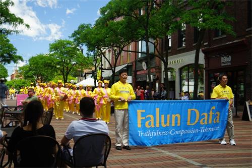 ![]() 图3:法轮功学员在伯灵顿市繁华市区展示五套功法 |