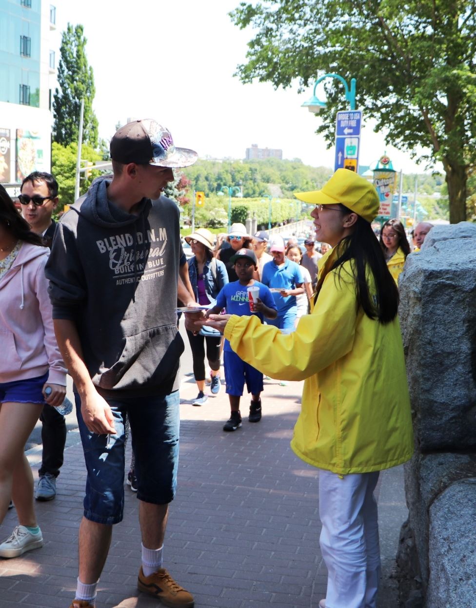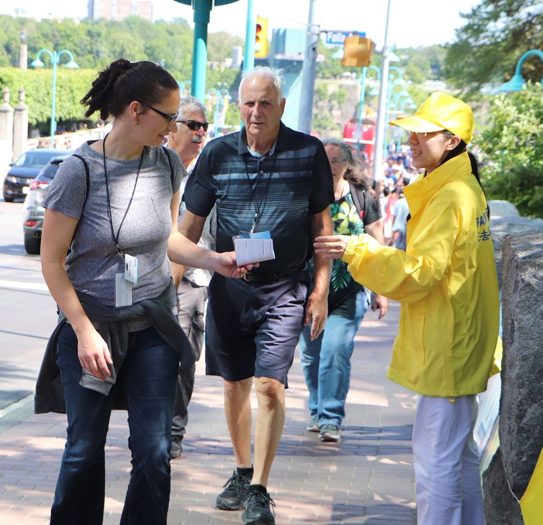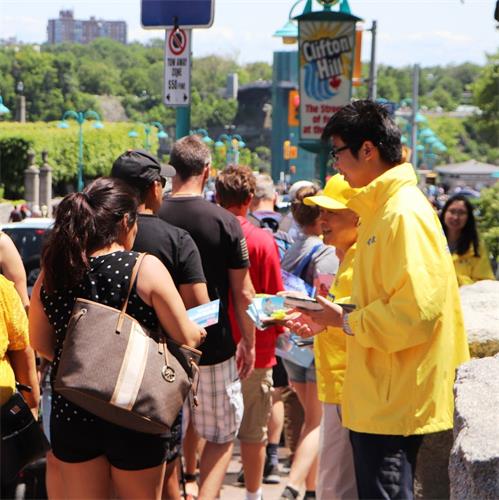 在美国大学毕业后到加拿大多伦多工作的青年学员煦忱,上周六来到了瀑布的景点弘法和讲真相,看他忙的一会儿教功,一会儿发资料,一会儿讲真相,一直没闲着。记者就问他:“感觉怎么样?”他说:“太多人了,简直都顾不过来。”等他停下来就聊了一会儿。他说:“从小跟外婆学法,长大后就不学了。二零一七年底开始走入修炼,才一年半时间,可以说是新学员吧。”