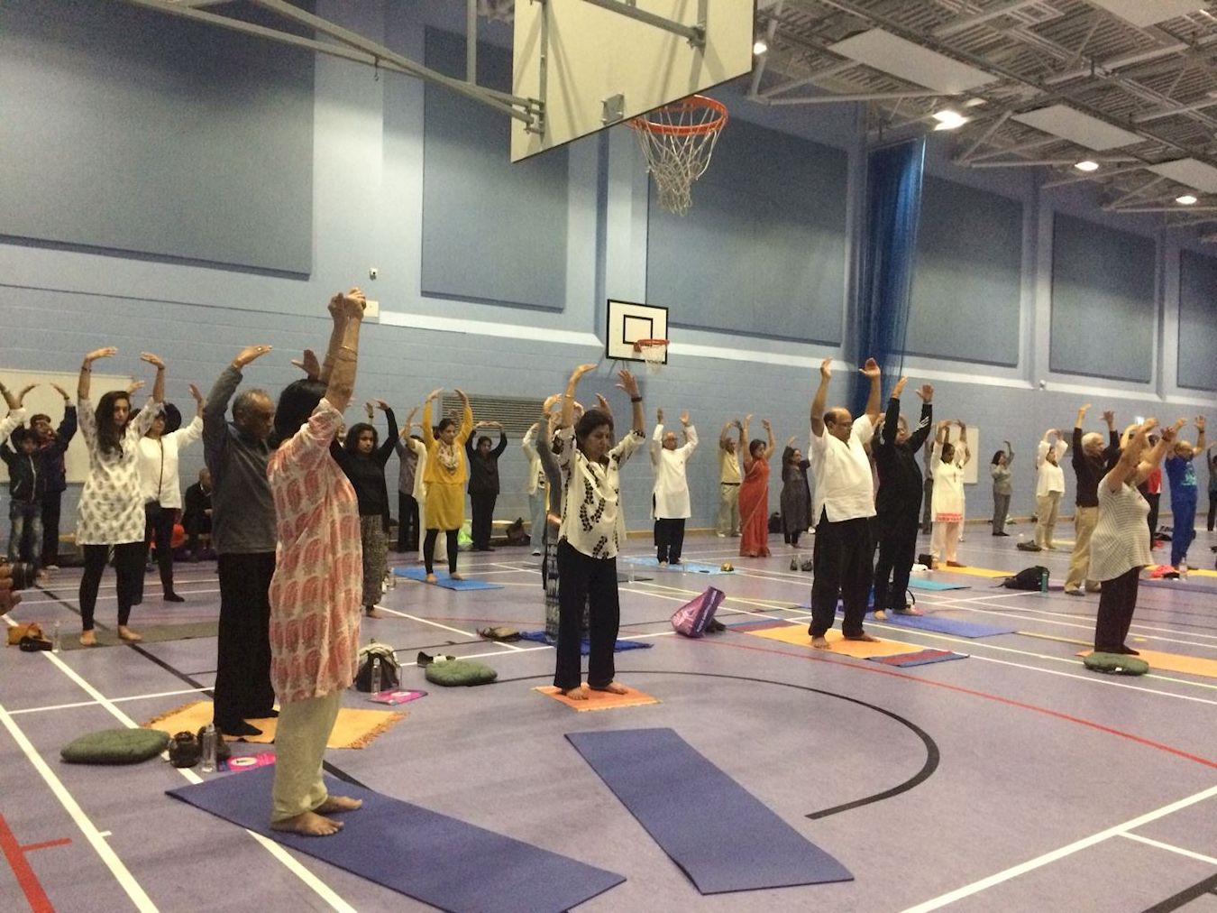 此次活动从上午十点至下午二点,法轮功学员在活动中演示了法轮功的功法,墙壁上两个视屏投影同时播放着李洪志先生的教功视频,在场的七十多名瑜伽爱好者踊跃尝试学炼功法动作。