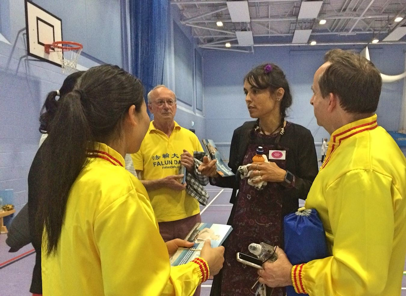 一位前来参加当天活动的男士和法轮功学员交谈了很久,他希望了解更多关于法轮功和法轮功弟子的事情,他问什么是法轮大法?法轮功遵循的“真、善、忍”中的忍是什么内涵?修炼是什么?法轮功学员根据自己的理解一一解答。交谈中,学员得知他看过神韵在伦敦的演出,他表示被神韵的纯善纯美震撼,看完神韵后,他对法轮功产生了浓厚的兴趣,主动到法轮功网站下载阅读了《法轮功》一书。