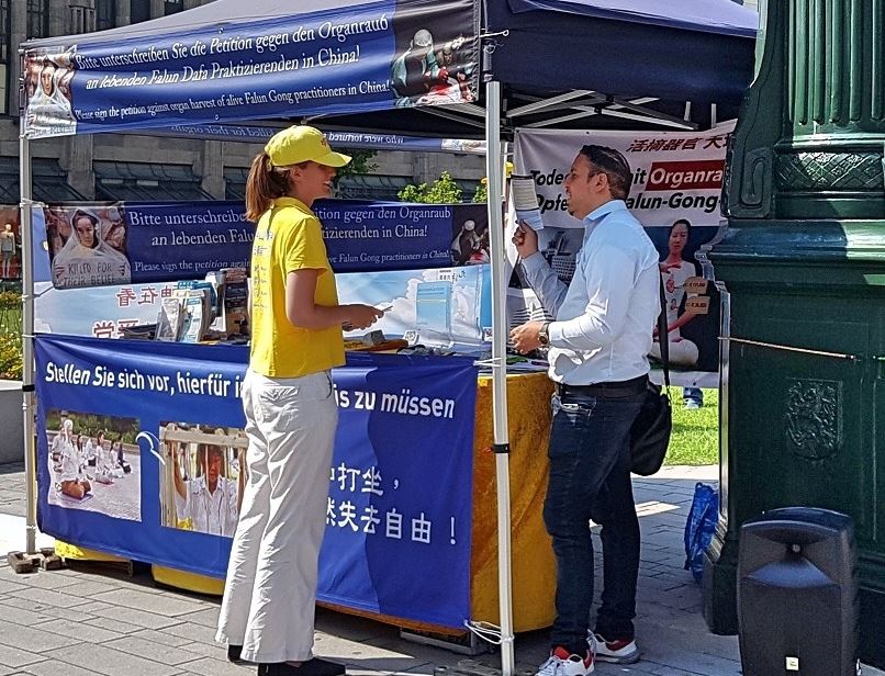 下午,学员们来到杜塞尔多夫的市中心,搭建真相点,并为反迫害征集签名。学员们的活动得到当地警察和民众的支持,有不少民众主动向学员了解真相,并签名支持法轮功学员制止迫害。