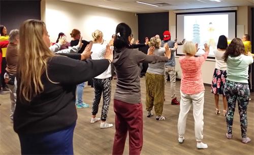 首先,法轮功学员布莱恩(Brain)向大家介绍了法轮功。当地学员现场展示法轮功的五套功法,而后大家跟随创始人李洪志先生的教功录像,现场一起学炼法轮功。当地学员们在大家身旁随时纠正大家的动作,整个炼功场面非常祥和。然后大家观看了一位西人学员修炼后,从满身是病到身体奇迹般恢复的神奇录像故事。