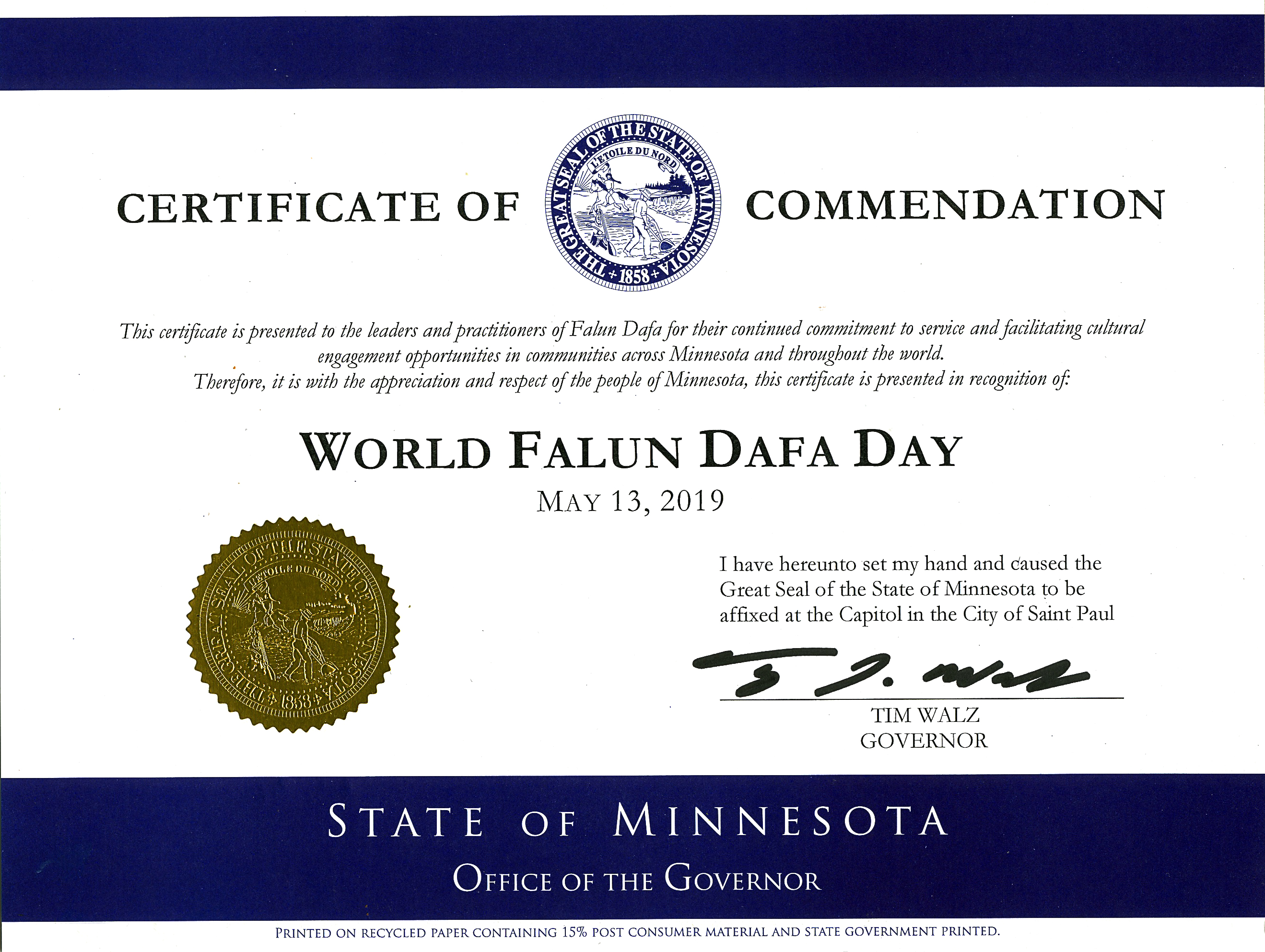 【明慧网二零一九年六月三日】二零一九年五月,美国明尼苏达州州长签发褒奖令,表达明尼苏达州民众对法轮大法的创始人和修炼者的感谢和尊重,并褒奖世界法轮大法日。