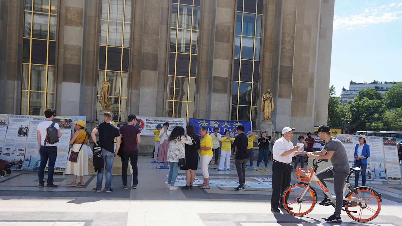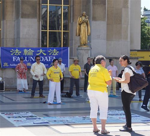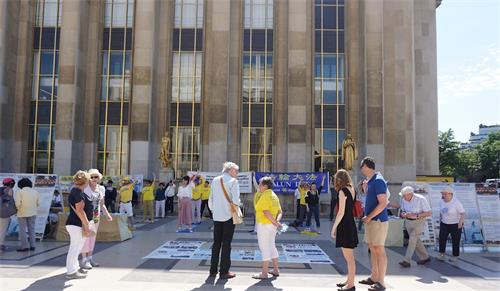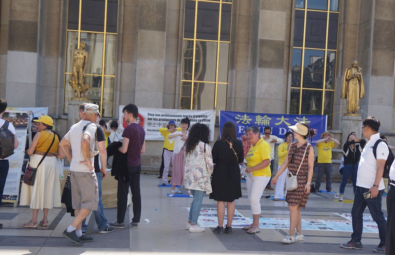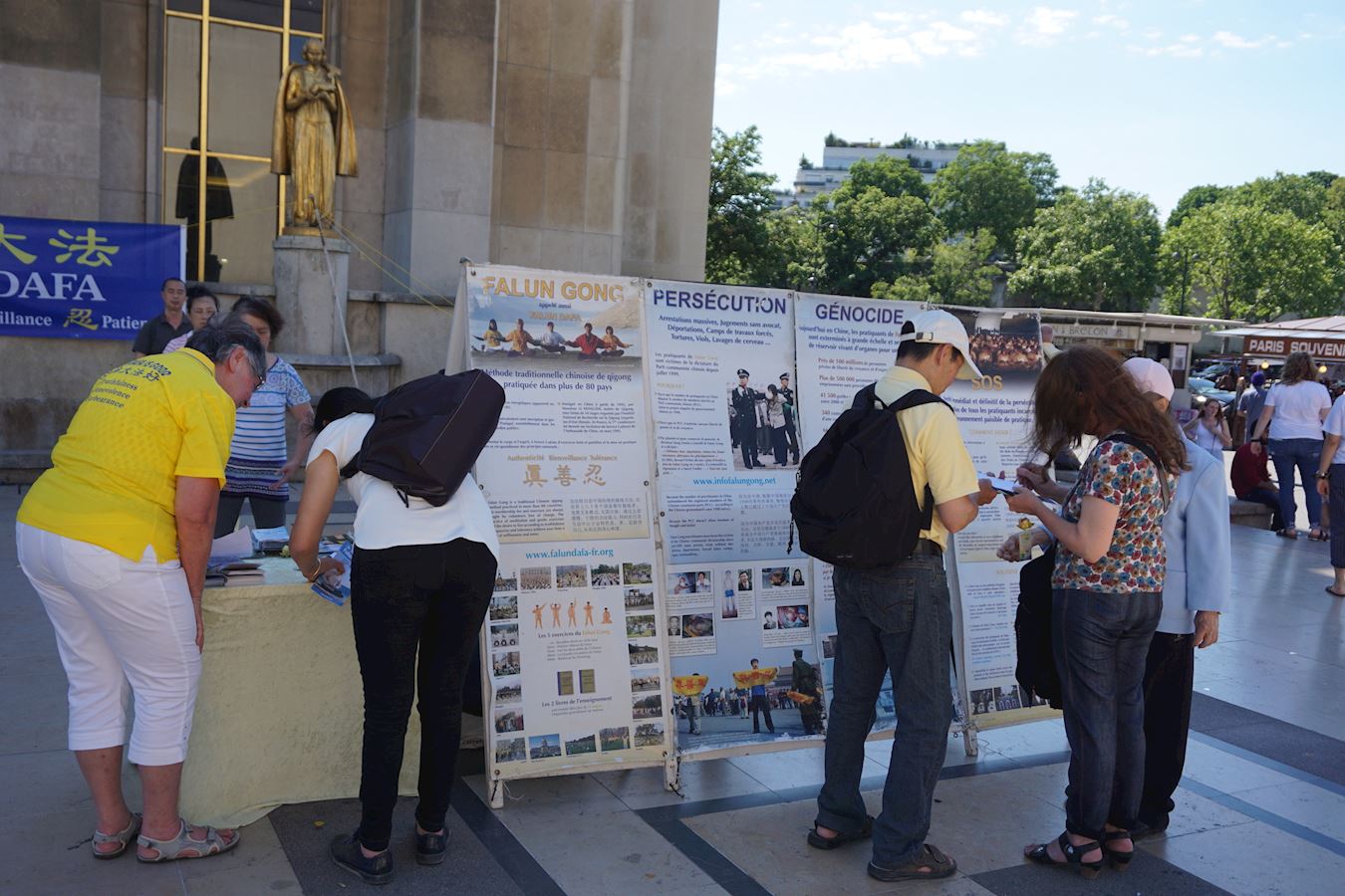 在广场的一侧,法国法轮功学员如每个星期天一样,在广场上摆放好法轮功受迫害的真相展板,拉起醒目的横幅。部份学员在祥和悦耳的炼功音乐的伴随下,安静地展示着法轮功的五套功法。成千上万的游客被吸引,他们驻足观看,索要资料。很多人都在“停止在中国对法轮功的迫害”征签表上签名,支持法轮功学员反迫害,也让中国游客有机会看到了法轮功在此揭露迫害的一幕。