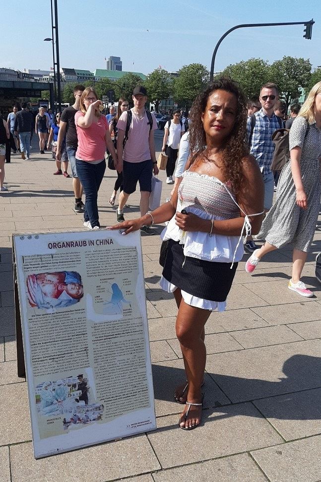 出生在克罗地亚的艾达(Aida)是一位年轻的精神科治疗师,在汉堡生活很长时间了。她告诉学员,她听说过活摘器官的事,但这次是她第一次见到法轮功学员及信息点。对于中共活摘器官的罪行,她说:“看到这些(关于迫害的内容)我很难受。我先看到的是那些数字(一个展板上写的关于器官买卖的价格)。我真的感到很不安,对人的谋杀显得这么容易,这样的罪行(居然)可以发生。”艾达说到自己也练习打坐,并表示:“这场迫害剥夺了我们的自由,我们都是有自由思想的人。”