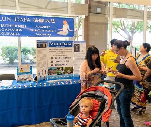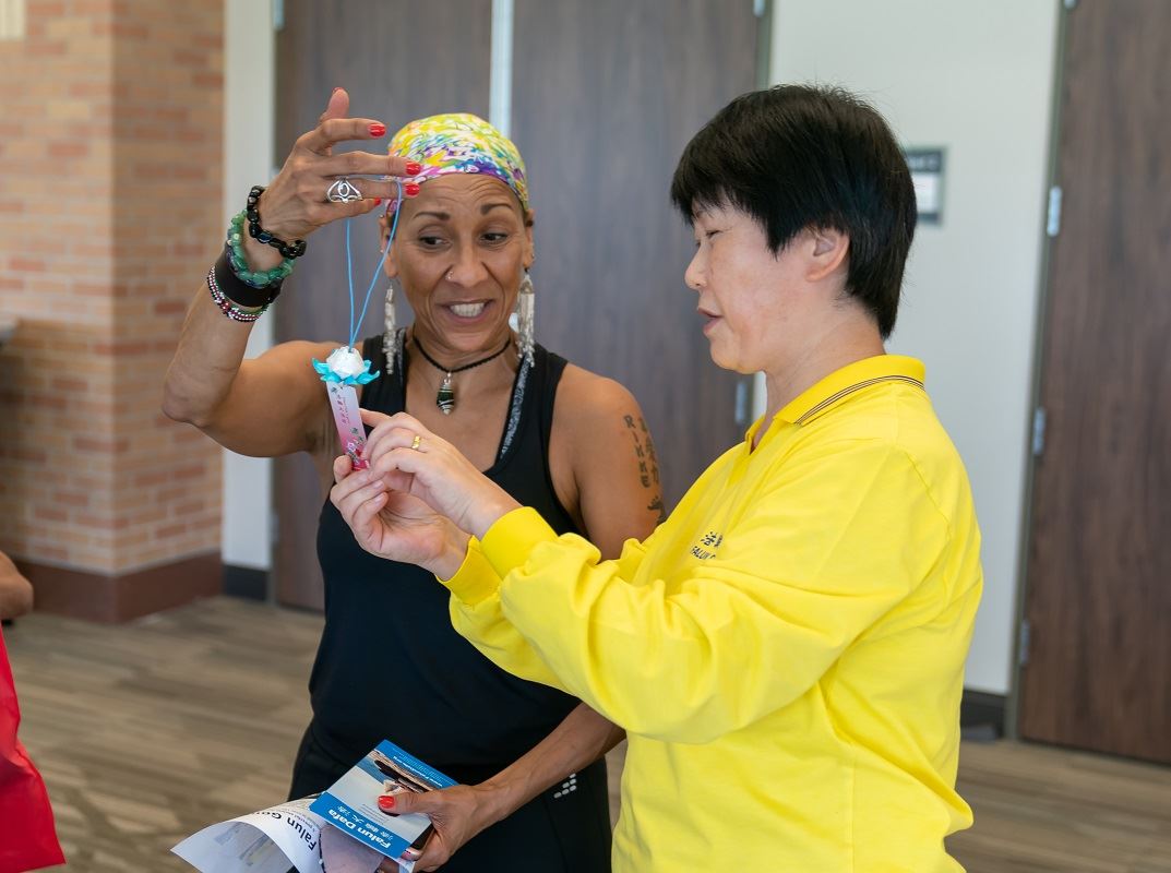 阿琳·琼斯(Arlene Jones)女士是活动当天的工作人员,在路过法轮功的展台时立即被学员舒缓的炼功动作所吸引,并情不自禁地模仿着学员的动作。据阿琳介绍,她十分喜爱佛教,认为内在修养比外在更加重要。每天早上都会坚持冥想(静坐),在看到法轮功学员展示的功法后,她感到内心产生了很大的共鸣,立即向学员询问并表示一定会去教功点上学功。