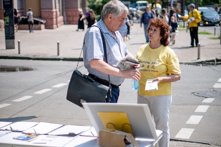 ![]() 图3:法轮功学员在基辅中使馆前向民众揭露中共迫害 |