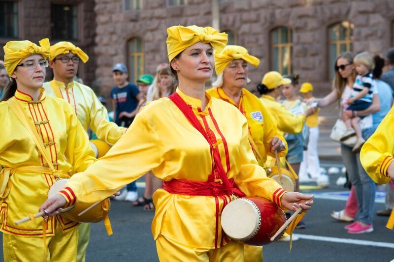 六月一日,法轮功学员在基辅市中心最繁华的商业大街、市政厅前举行弘法活动。学员演炼功法动作,向世人介绍法轮功,并通过优美的舞蹈、欢乐的舞龙及腰鼓展现大法弟子的精神风貌,表达他们对中国传统文化的喜爱。