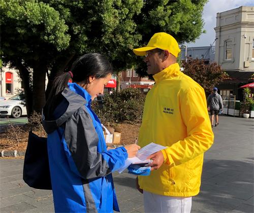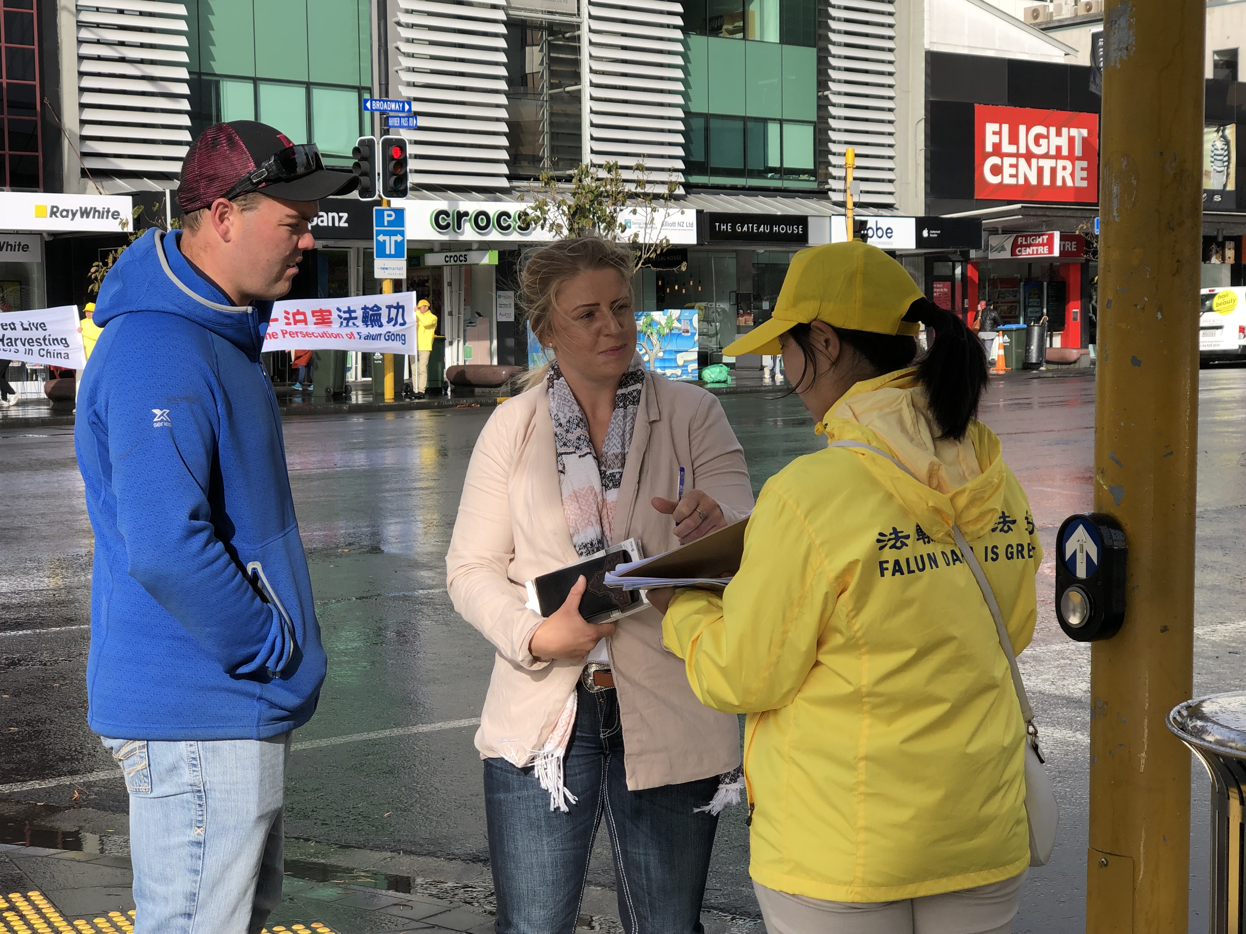 埃尔帕·米娜(Alpa Minar)在银行工作,移民来新西兰十七年,从发资料的学员那里听说了在中国发生的活摘法轮功学员器官的事。她说,如果你们没有站出来,没有人会知道这些事,但是我个人有听说过在中国发生的这些事。今天很高兴,看见法轮功学员们在这里,让公众来关注在中国发生的事。他们打坐炼功,这是非常和平,理性的。以前我有时会路过,见到他们站在那里和平呼吁,现在我拿到资料了,我会好好了解真相。