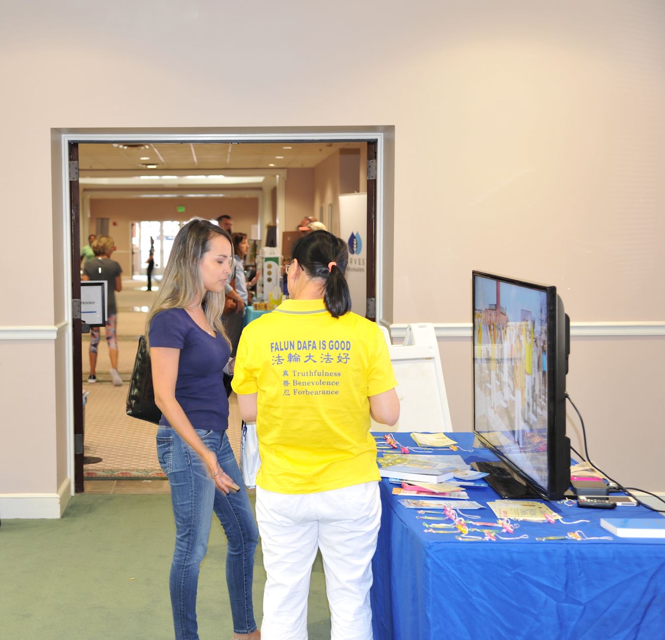 法轮功学员随着炼功音乐优美舒缓的功法动作,吸引了当地人们的注意,很多对法轮功感兴趣的人们都在摊位前驻足,并开始了解法轮功,还向学员们学习功法动作。