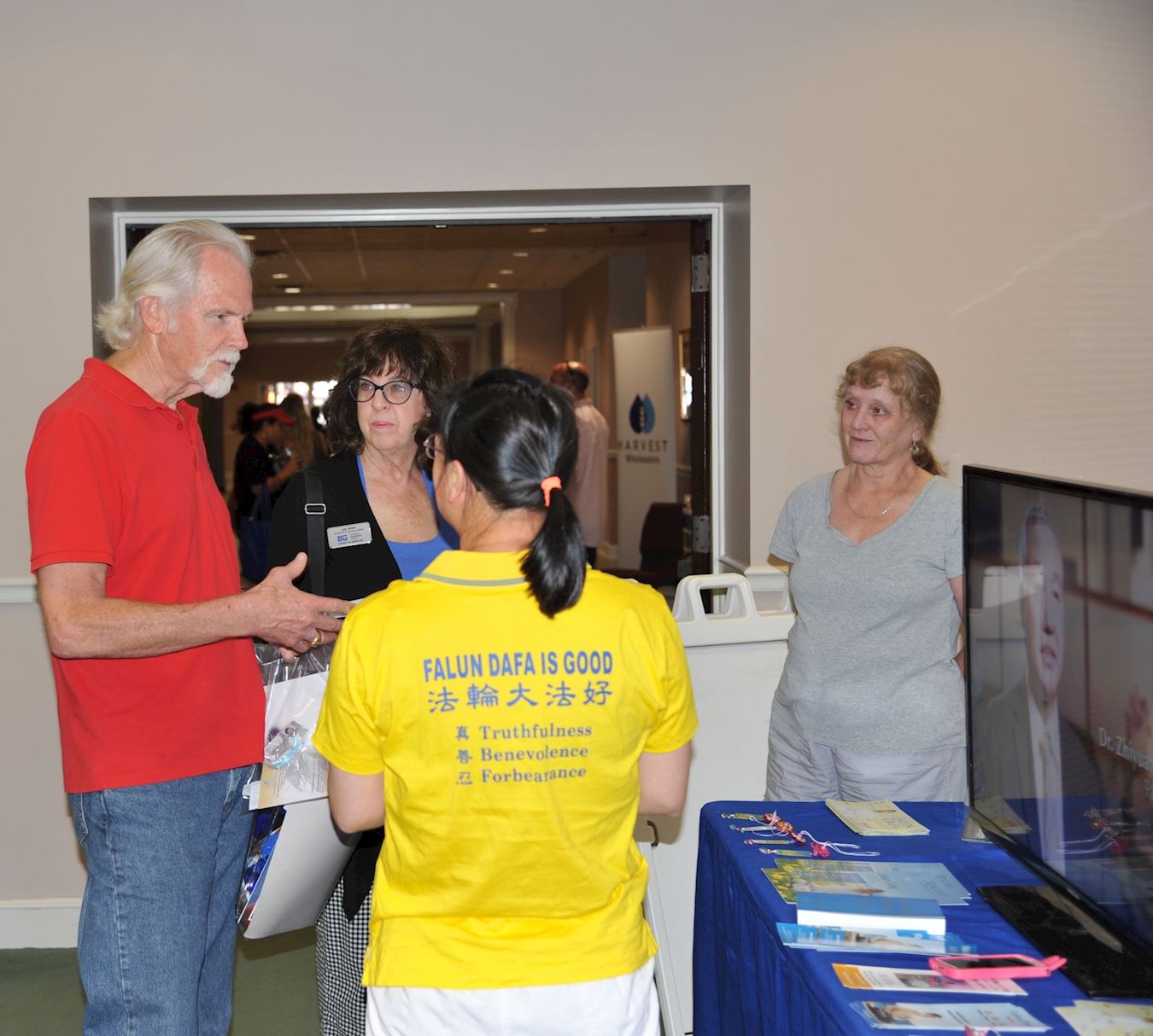 ![]() 图2:来自约翰溪市的尼德夫妇在亚特兰大约翰溪市健康博览会向法轮功学员了解法轮大法。 |