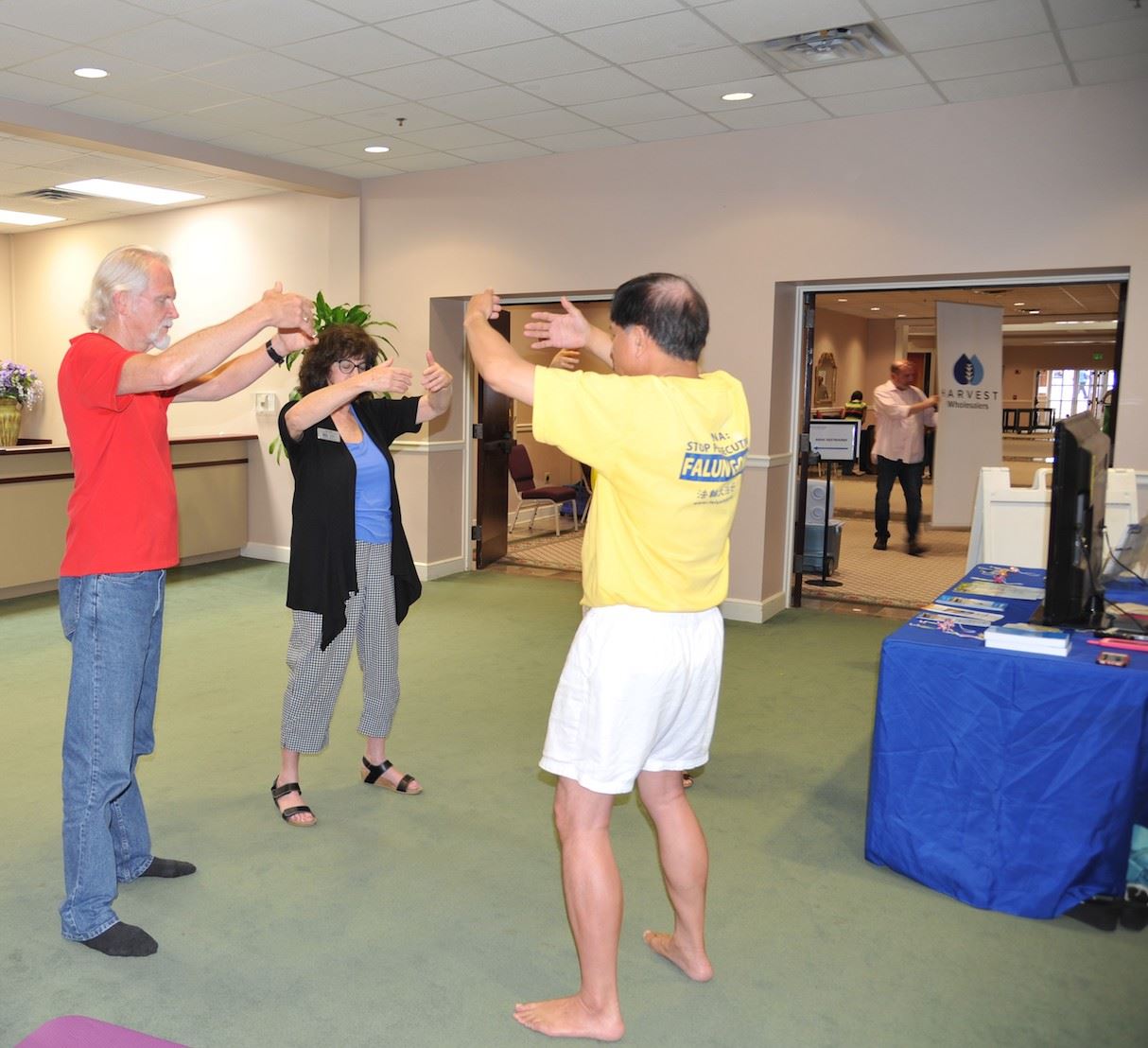 唐尼德(Don Neder)先生和盖尔尼德(Gail Neder)女士住在约翰溪市,他们看到法轮功学员的功法展示后,驻足观看,并在法轮功学员介绍后,开始学习功法动作。尼德先生说:“当我从法轮功展台前走过时,我觉的这个功法很有意思,我就很想了解更多。”他还说:“我总是保持一个非常开放的思想,希望能够了解能够提升自己思想和帮助我获得健康的功法。今天我在这了解了很多关于法轮功的信息,也炼了一会儿功法,我就想从精神上和身体上获得健康,现在我感觉很棒。”