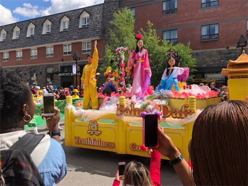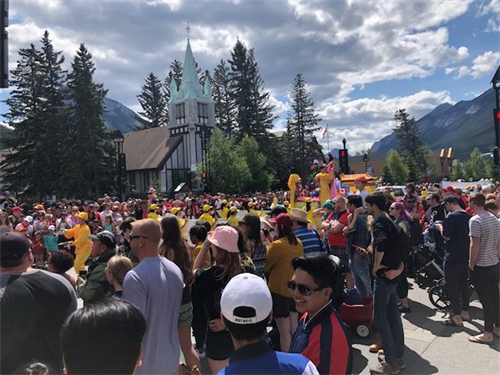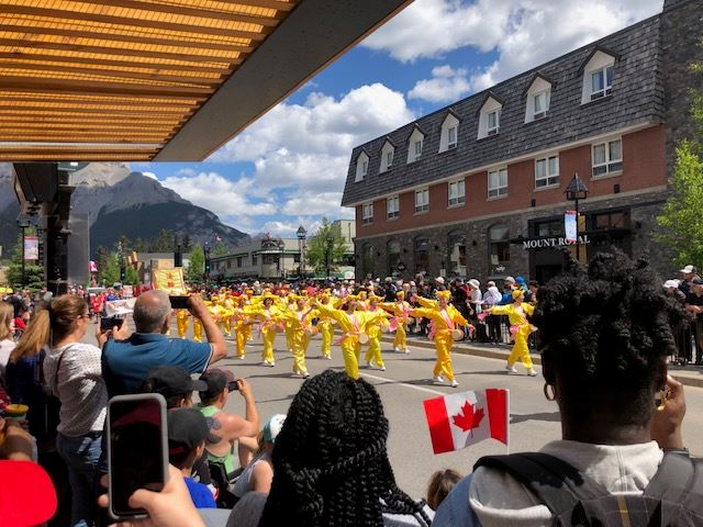 11点游行开始,来自世界各地的游客和班芙地区及附近小镇的人们早已挤满了主要街道的两旁。阳光下金黄色法轮功花车显得格外耀眼,加上身着金黄色服装的法轮功腰鼓队学员,配上粉色鼓带,在蓝天青山的映衬下显得端庄秀美。