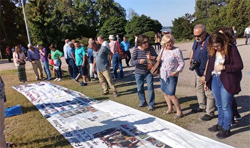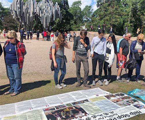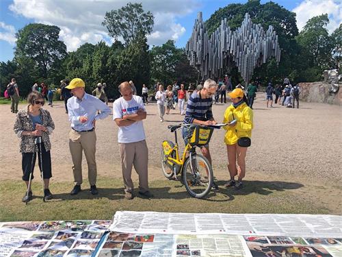 许多游客在一封法轮功学员的公开信前驻足阅读,信中说到:“我们是一群生活在芬兰的法轮功修炼者。法轮功是以‘真、善、忍’为原则的修炼方法,在世界深受欢迎。因为很多中国游客到这里参观,所以我们每天来这里给中国人讲述发生在中国的对法轮功的迫害,唤起人的良知。由于中共给中国人洗脑并封锁网络,很多中国人还不知道这场迫害的存在。中共从一九九九年开始迫害法轮功。那时,中国修炼法轮功的人数已达一亿,超过了中共党员的人数,江泽民处于对法轮功的妒嫉,发起了对法轮功的迫害。我们当中很多人亲身经历过迫害和折磨,被迫逃离中国。我们当中的人有自己的亲戚和朋友已经被迫害致死……我们在这里义务告诉您这些,因为迫害还在进行着,无辜的人每天还在被关押。而且无数法轮功学员的人体器官在人还活着时被摘取。我们不接受任何经济援助,只愿您在征签单上签名,以结束这场迫害和杀戮。”公开信被翻译成英语,芬兰语,瑞典语,法语,意大利语,俄罗斯语,日语,韩语,等等。很多游客读完后立即要征签支持法轮功学员。