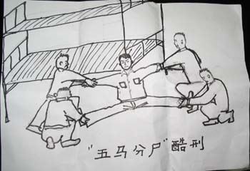 “五马分尸”:就是把人的四肢向四个不同方向拉开,越拉越紧进行毒打。整个人痛得象被撕开一样。