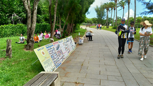 【明慧网二零一九年七月十四日】不管严寒酷暑,游客们总会看到一群黄衣身影的法轮功学员在鹅銮鼻公园内,或讲真相、或发真相报纸;通往灯塔的走道两旁摆放着法轮功真相展板;一旁草坪上,还有学员的炼功场景,动作优美舒缓,场面宁静祥和。