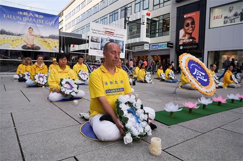 ![]() 图5:在法兰克福市中心,法轮功学员举行烛光夜悼活动,路人驻足认真阅读揭露迫害的信息。 |
