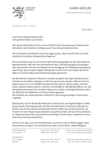 德国国会议员贝婷娜·葳丝蔓(Bettina M. Wiesmann)和黑森州州议会副议长卡琳·穆勒 (Karin Müller)特地给法轮功学员发来致辞。在当天的集会上,法轮功学员用德文和中文向公众传达了她们的正义之声。