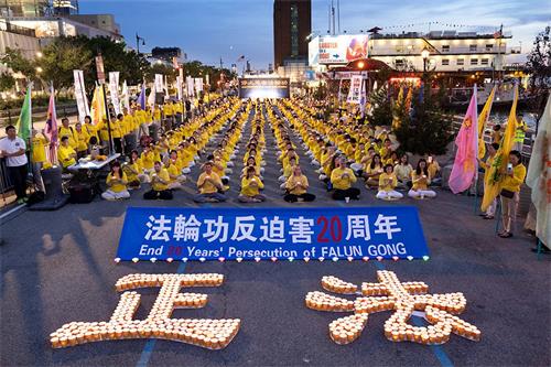华灯初上,法轮功学员手举蜡烛和莲花灯,默默悼念被迫害致死的法轮功学员,场面肃穆、感人;最前面,由蜡烛组成的“正法”两字灼灼生辉。凉风习习,吹拂着法轮功学员坚韧、善良的面庞。