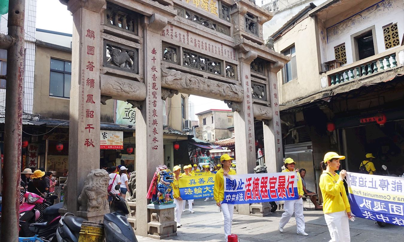 下午2时40分,法轮功学员的游行队伍从总兵署出发,各个手持“7.20全球法轮功反迫害”、“声援中国民众 法办元凶江泽民”、“呼唤良知 制止迫害”、“中共盗卖活摘器官 天理不容”等醒目标语,穿梭金门最繁华的金城市区,引起不少民众注目,其中逼真的揭露中共活摘法轮功学员器官的行动剧,更令人震惊。